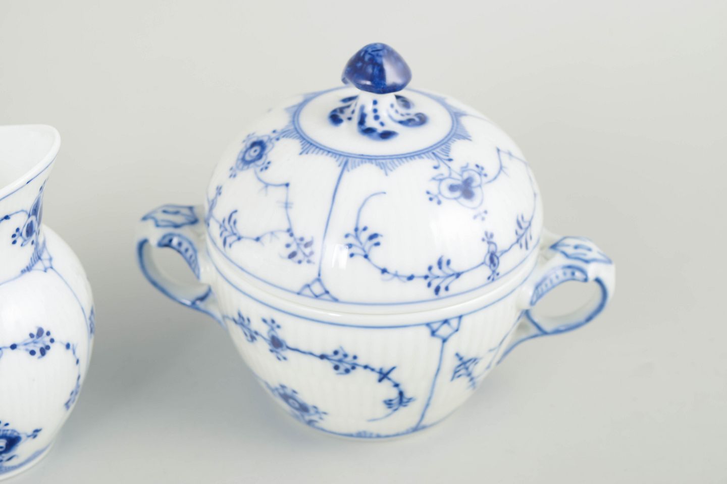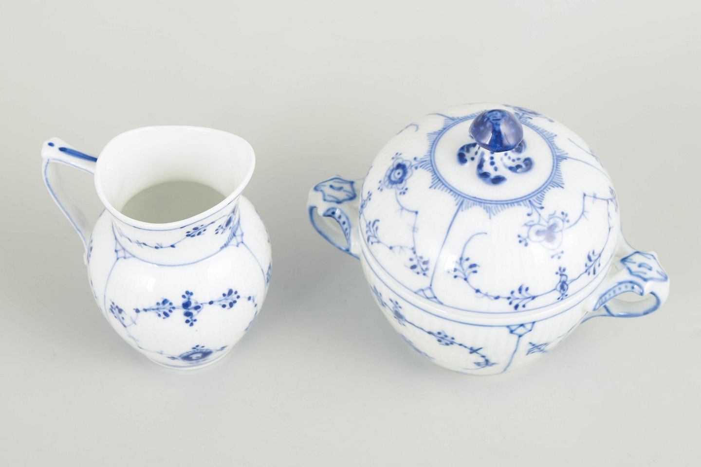 Flødekande og sukkerskål i håndmalet underglasurblå dekoration i det klassiske Musselmalet riflet-stel. Flødekande model 1/60 og sukkerskål model 1/244.