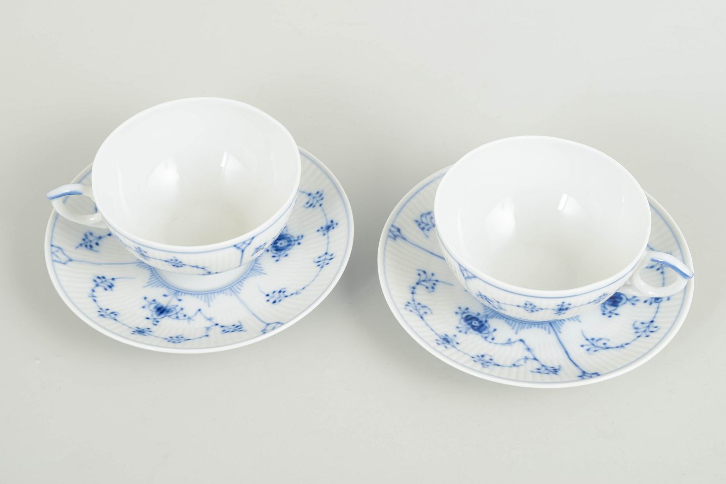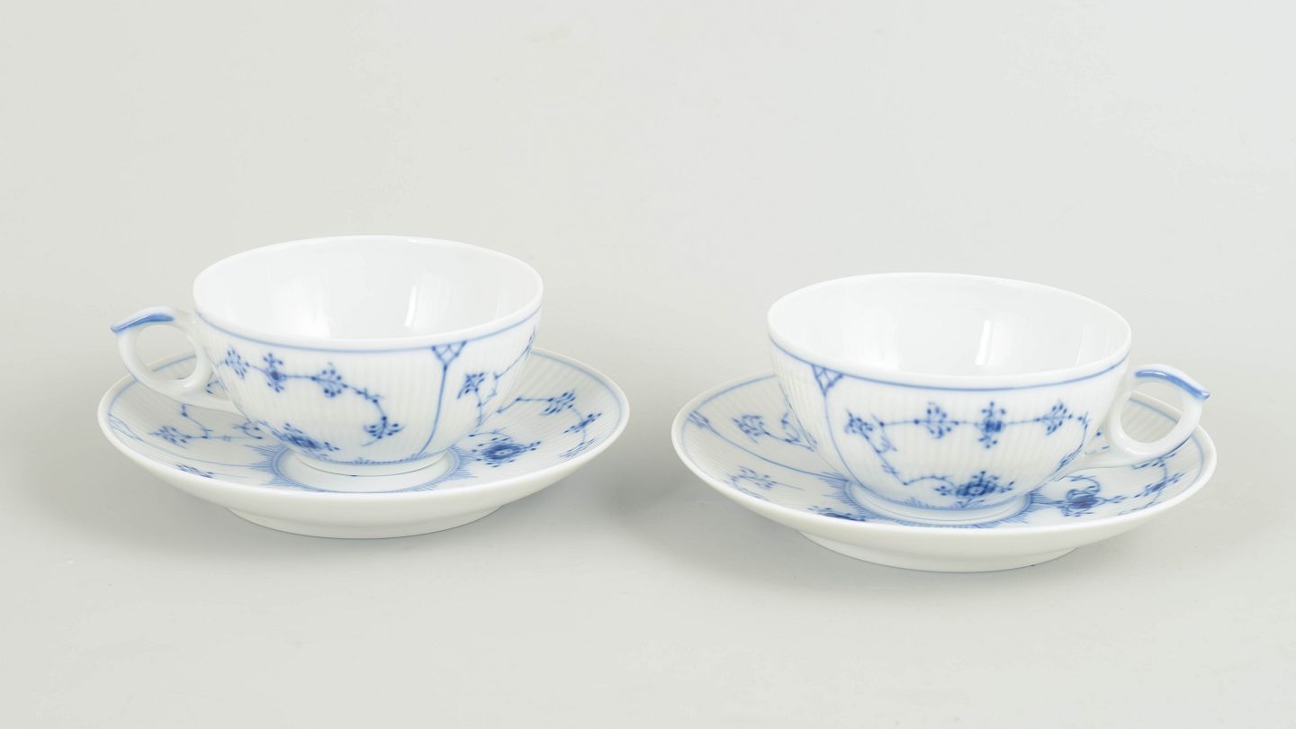 To tekopper med tilhørende underkopper i håndmalet underglasurblå dekoration i det klassiske Musselmalet riflet-stel. Kopper model 078, underkopper model 082. Annulleret med én indridsning.