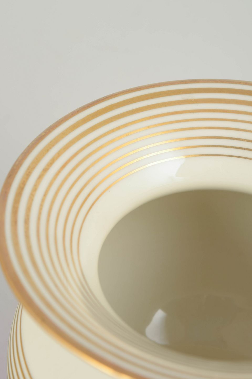 Art deco–formet porcelænsvase med balusterkrop, flad fod og udadbøjet munding. Dekoreret med brede horisontale bånd i rød og elfenbenshvid med forgyldte linjer. Underglasur fabriksstempel “Johann Seltmann Vohenstrauss Bavaria” under bunden.