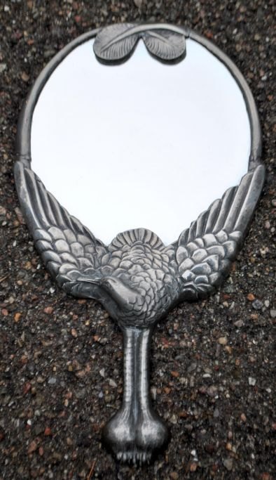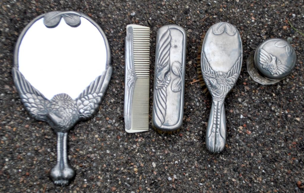 Hertz/Mogens Ballin Toilettenset aus Zinn, Art déco, Entwurf 1719. Um 1920. Kopenhagen, Dänemark. Bestehend aus Spiegel, Kamm, zwei Bürsten und einem Gefäß mit Deckel. Verziert mit Kranich und Blattwerk. Spiegellänge: 33 cm. Gestempelt.