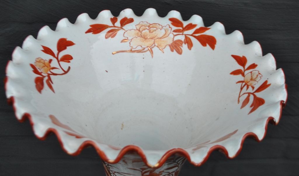 Japanische Kutani-Vase, 19. Jahrhundert. Handbemalt. Verziert mit Motiven wie Bäumen, Blumen und Vögeln. Polychrome Bemalung mit Vergoldung. Wellenrand. Höhe: 94 cm. Durchmesser: 33,5 cm. Höhe inkl. Fuß: 113,5 cm.