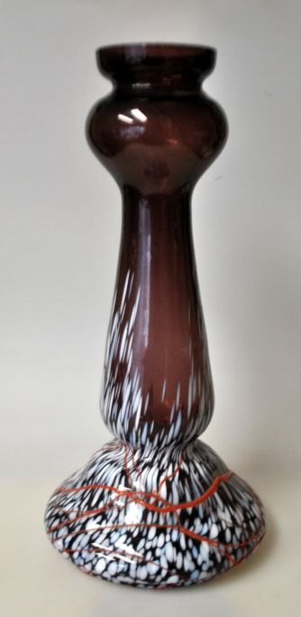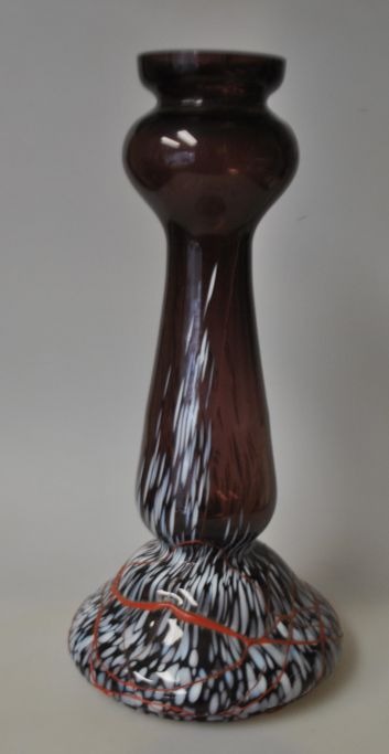 Jugendstilvase, um 1900, Deutschland. Violettes Glas mit einem Sockel aus weißem, blauem und grauem Glas. Roter Glasrand darüber. Höhe: 29,5 cm.