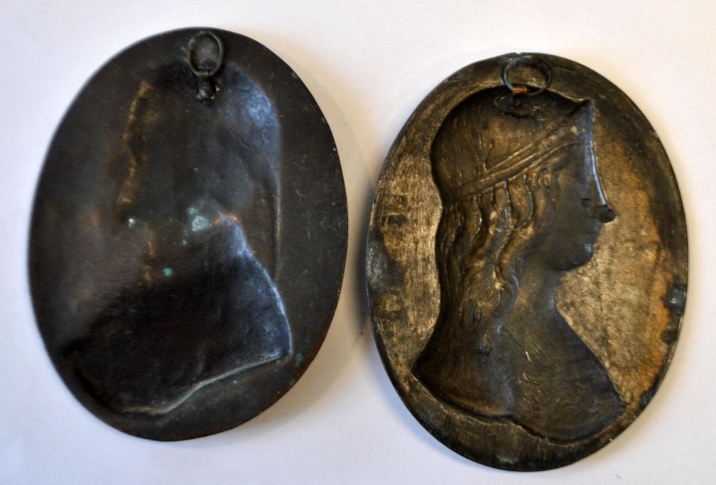 Zwei ovale Reliefs von Dante und Beatrice, 19. Jahrhundert. Italien. Metall. 11,5 x 9 cm. Zum Aufhängen.