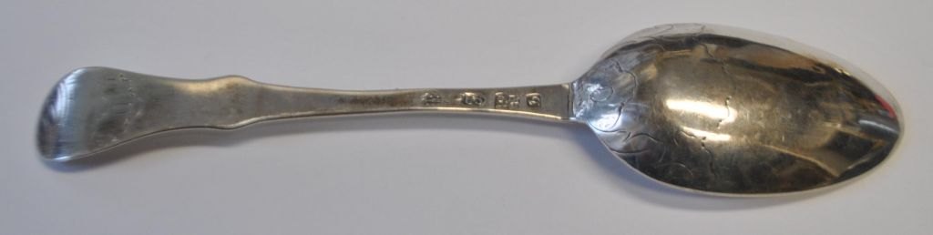 Niels Pihl (ca. 1745–1796), Kopenhagen, Dänemark: Rokoko-Silberlöffel, gestempelt 1778. Mit Rokoko-Verzierungen. Länge: 20,5 cm. Gewicht: 54 Gramm.