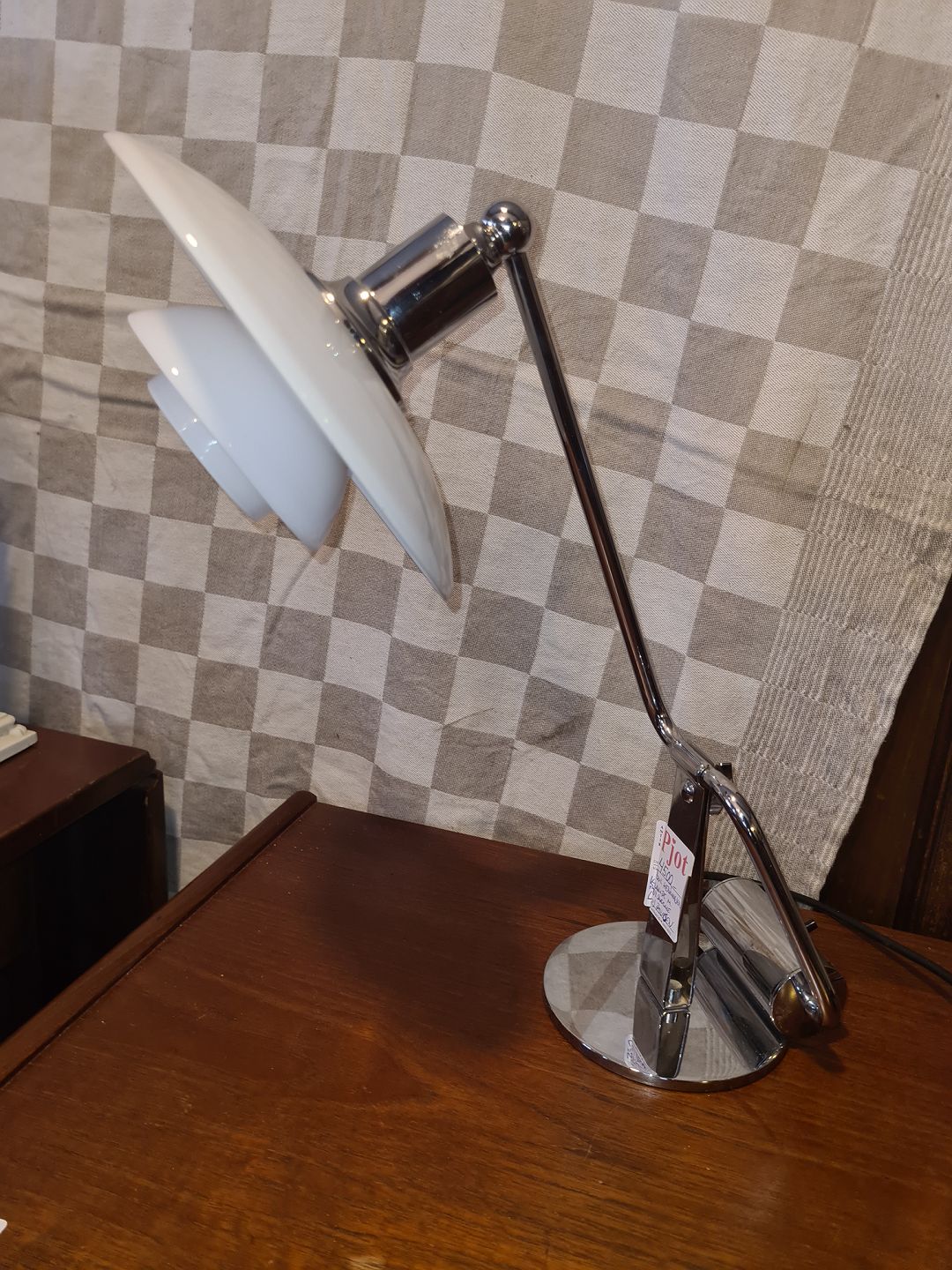Text zugänglich auf Dänische: Poul Henningsen PH-2/1 Klaverlampe m. skærme i hvid opalglas og chrome stel.