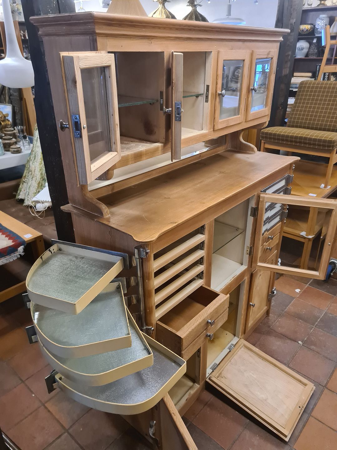 Text zugänglich auf Dänische: Ældre originalt tandlægeskab i fyrretræ med låger og hylder i glas og metal.