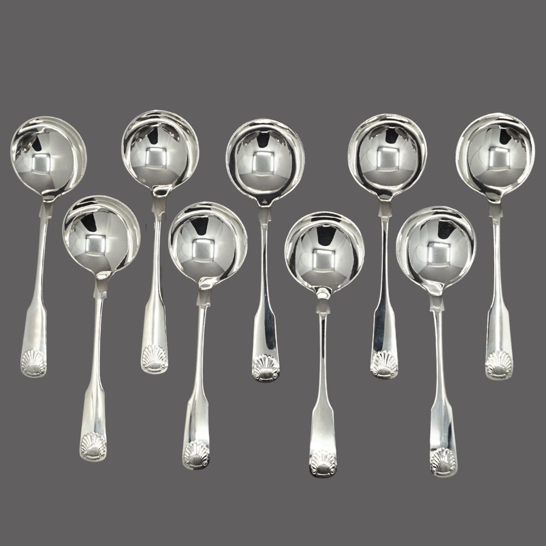 Text zugänglich auf Dänische: Sæt af 9 Musling bouillonskeer i sølv