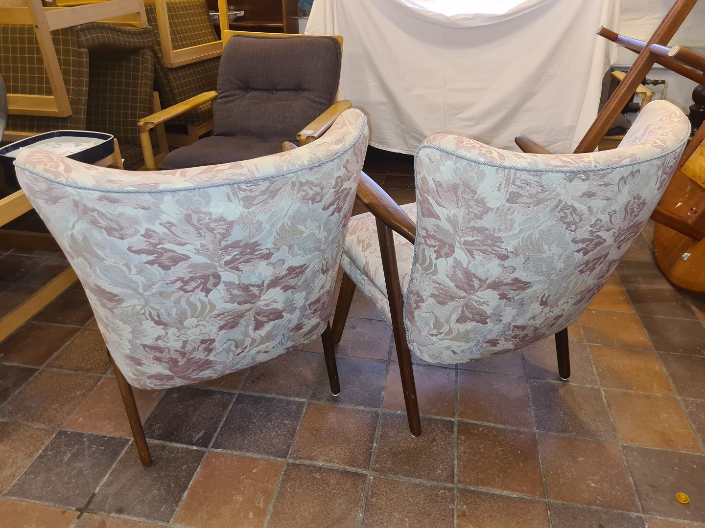 Text zugänglich auf Dänische: Erhardsen & Andersen par lænestole med stel i teak, betrukket med møbelstof.