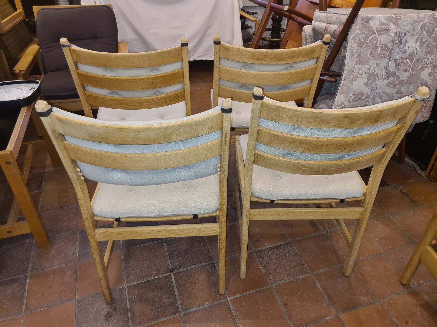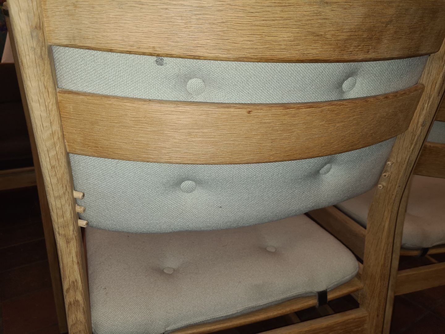 Text zugänglich auf Dänische: Kurt Østervig sæt af 4 spisebordsstole udført i massiv eg, samt hynder i stof.