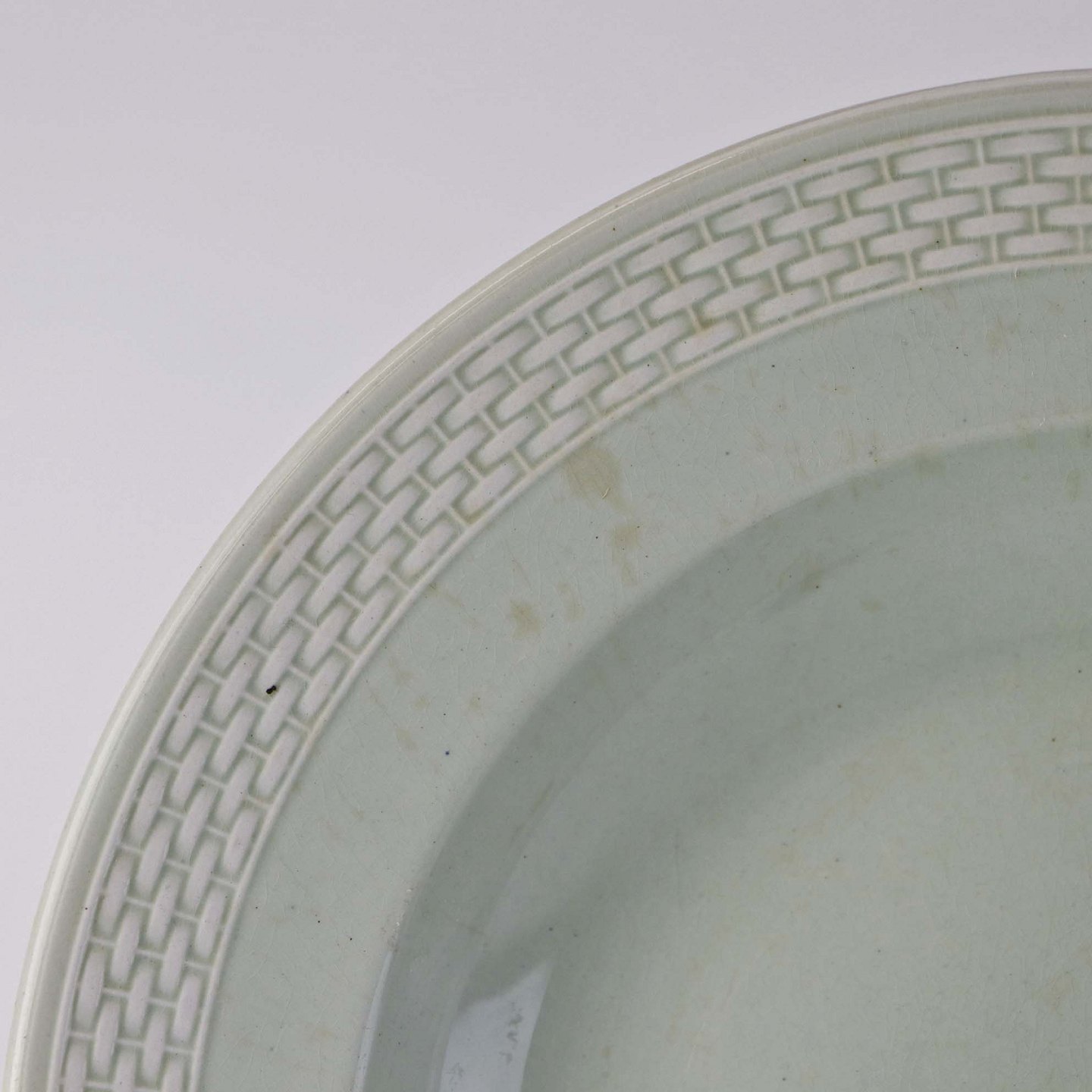 Fajancestel i stelform Viktoria II med fletværk i en lys mintgrøn farve med flettet dekoration langs kanten.