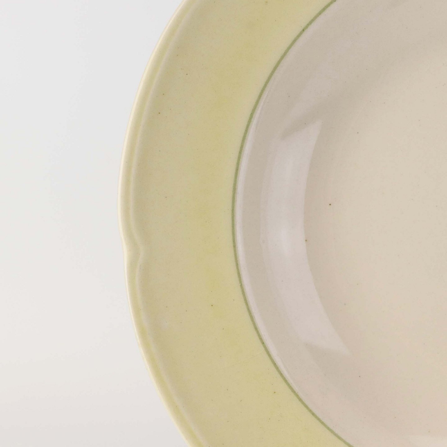 Fajancestel med gul dekoration på lys baggrund og med vissengrøn streg.