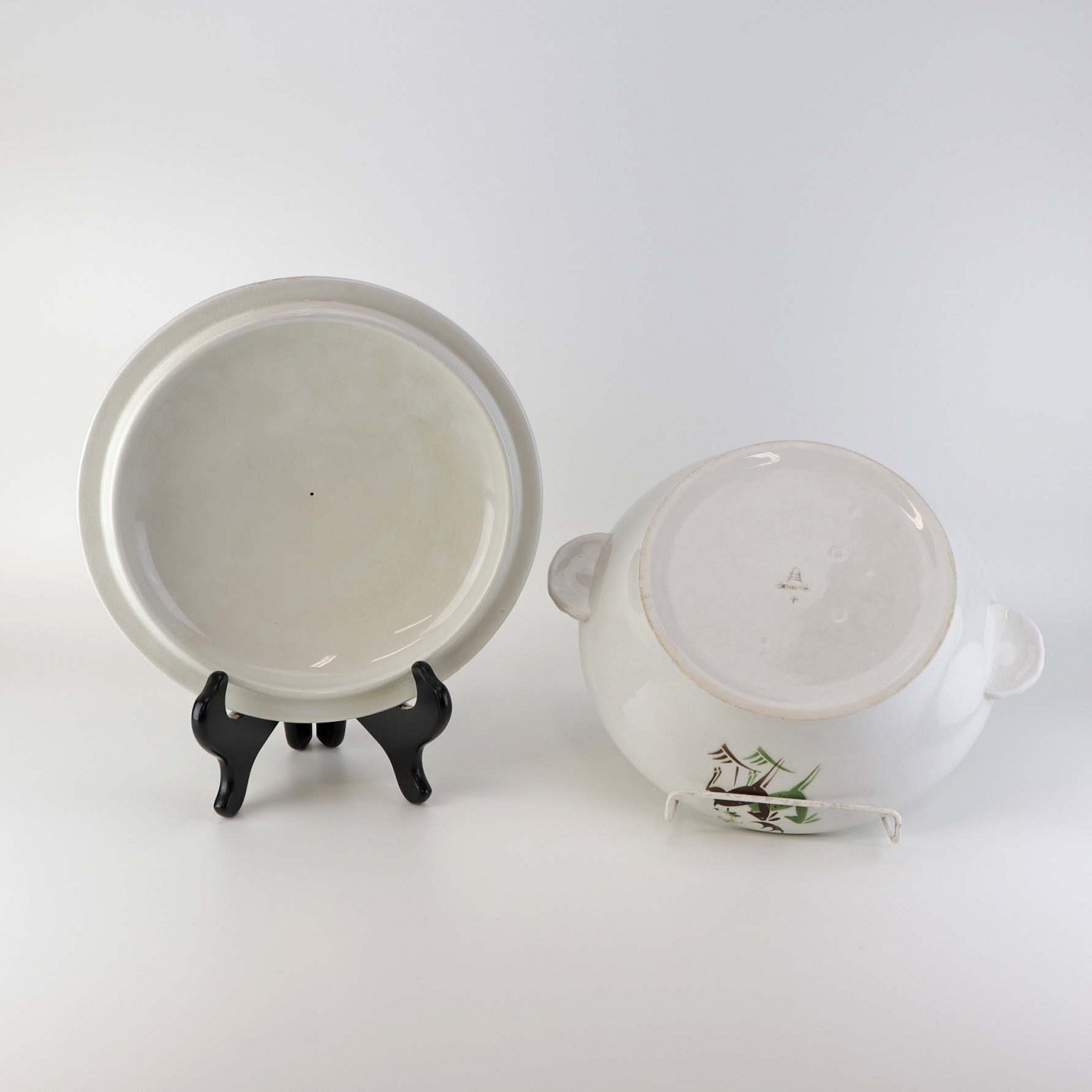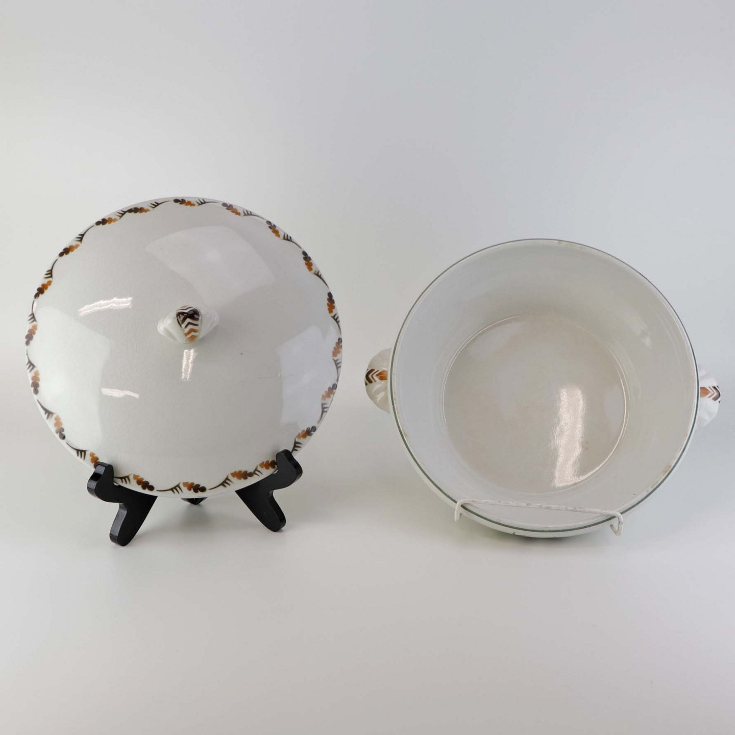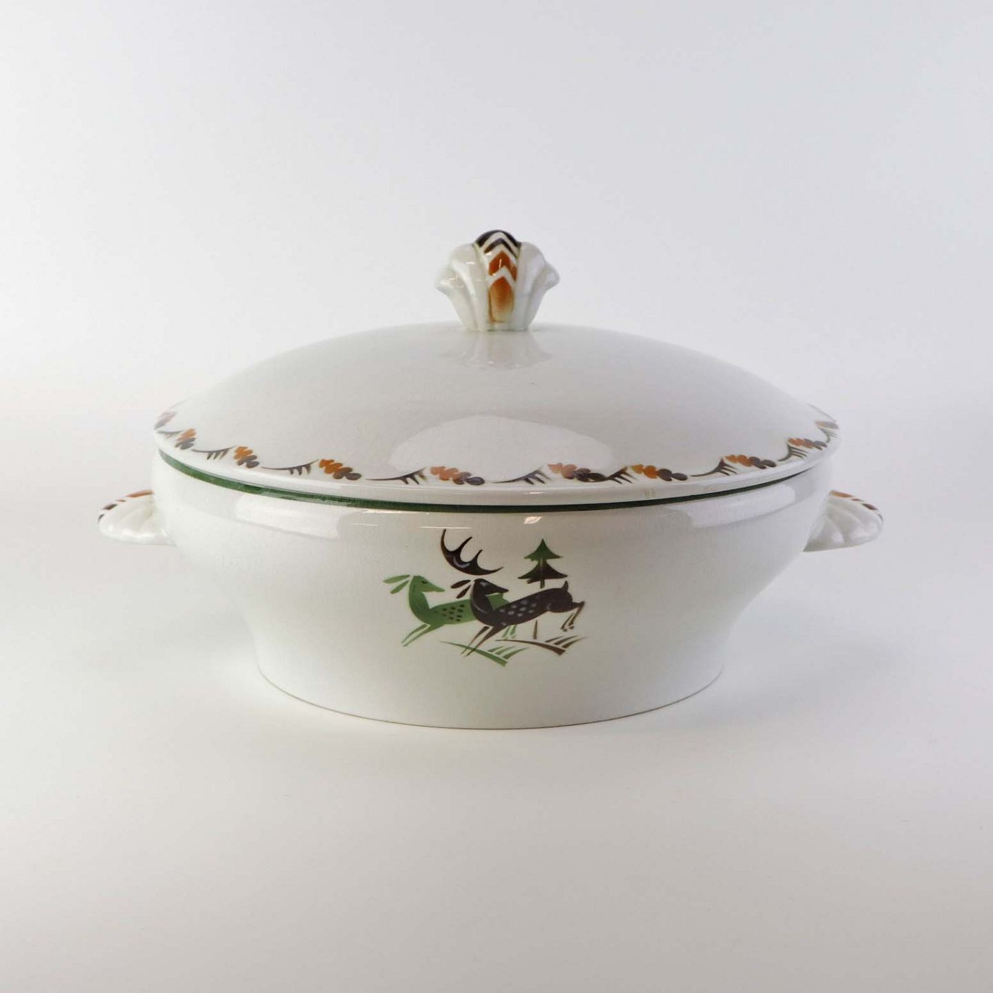 Terrin med låg i fajance fra Hjortestellet Convolvolus, som blev fremstillet i perioden 1930-1940