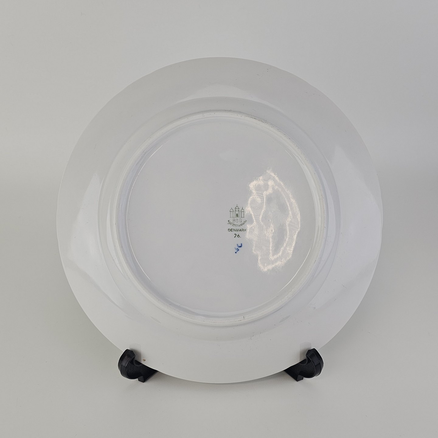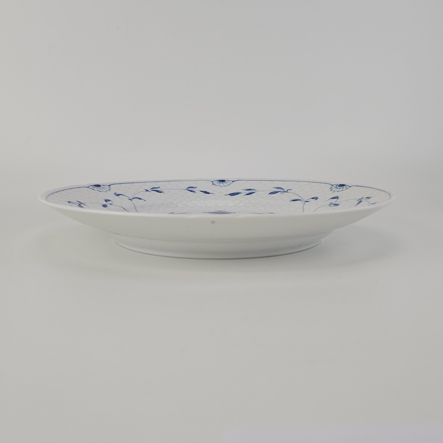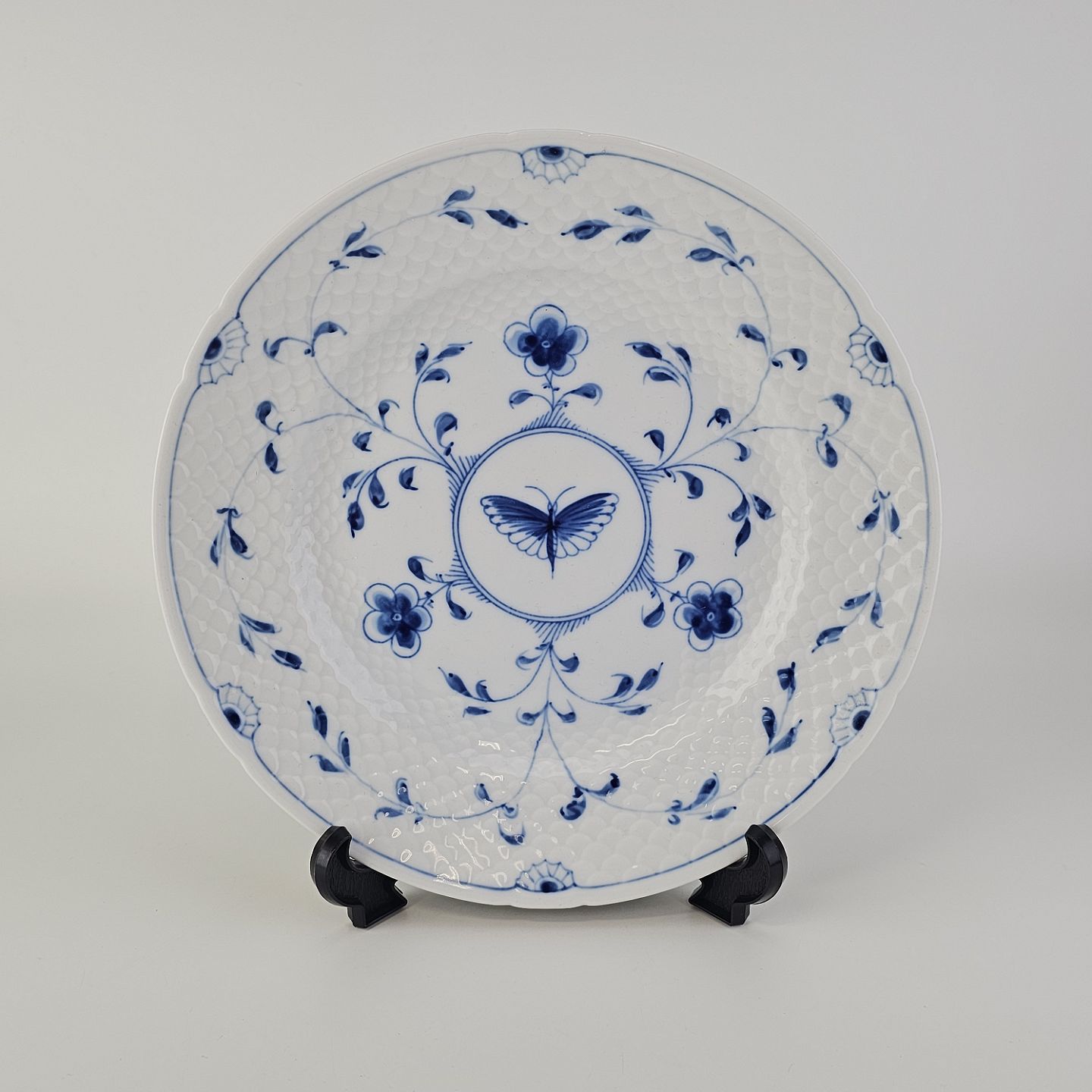 Service i hvidt skælformet porcelæn med blå motiver af blomster og sommerfugle
