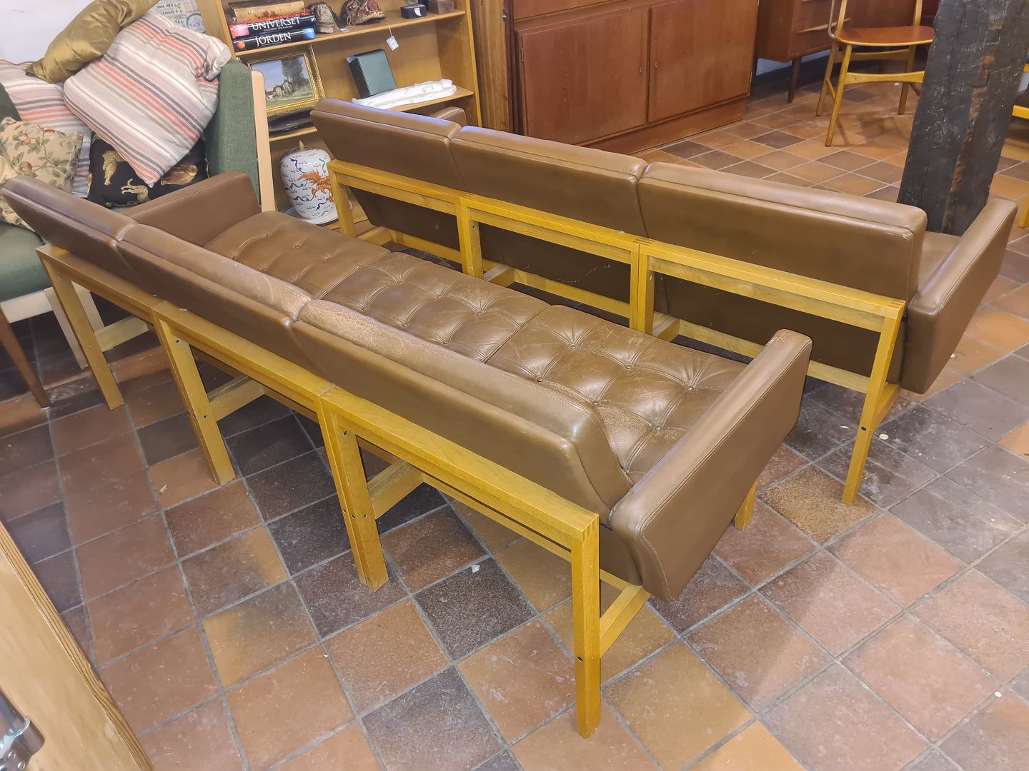 Text zugänglich auf Dänische: Par 3 personers sofaer i eg og læder designet af Ole Gjerlev Knudsen Moduline model. Fremstillet i 1970'erne. Fremstår står pæne og ok velholdte dog med lidt overfladiske brugsspor på den ene og mindre hul i sæde på den anden. (Billeder)