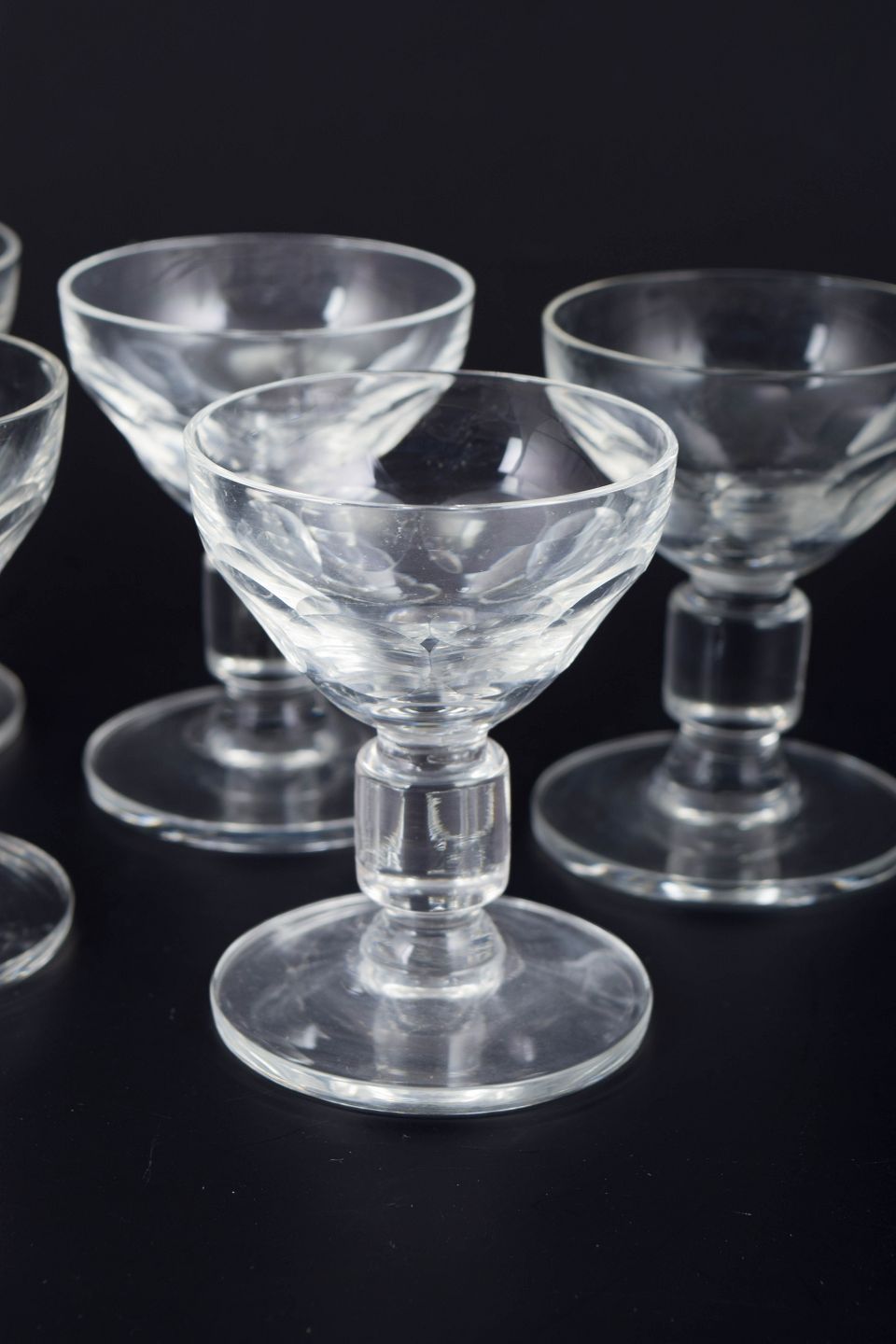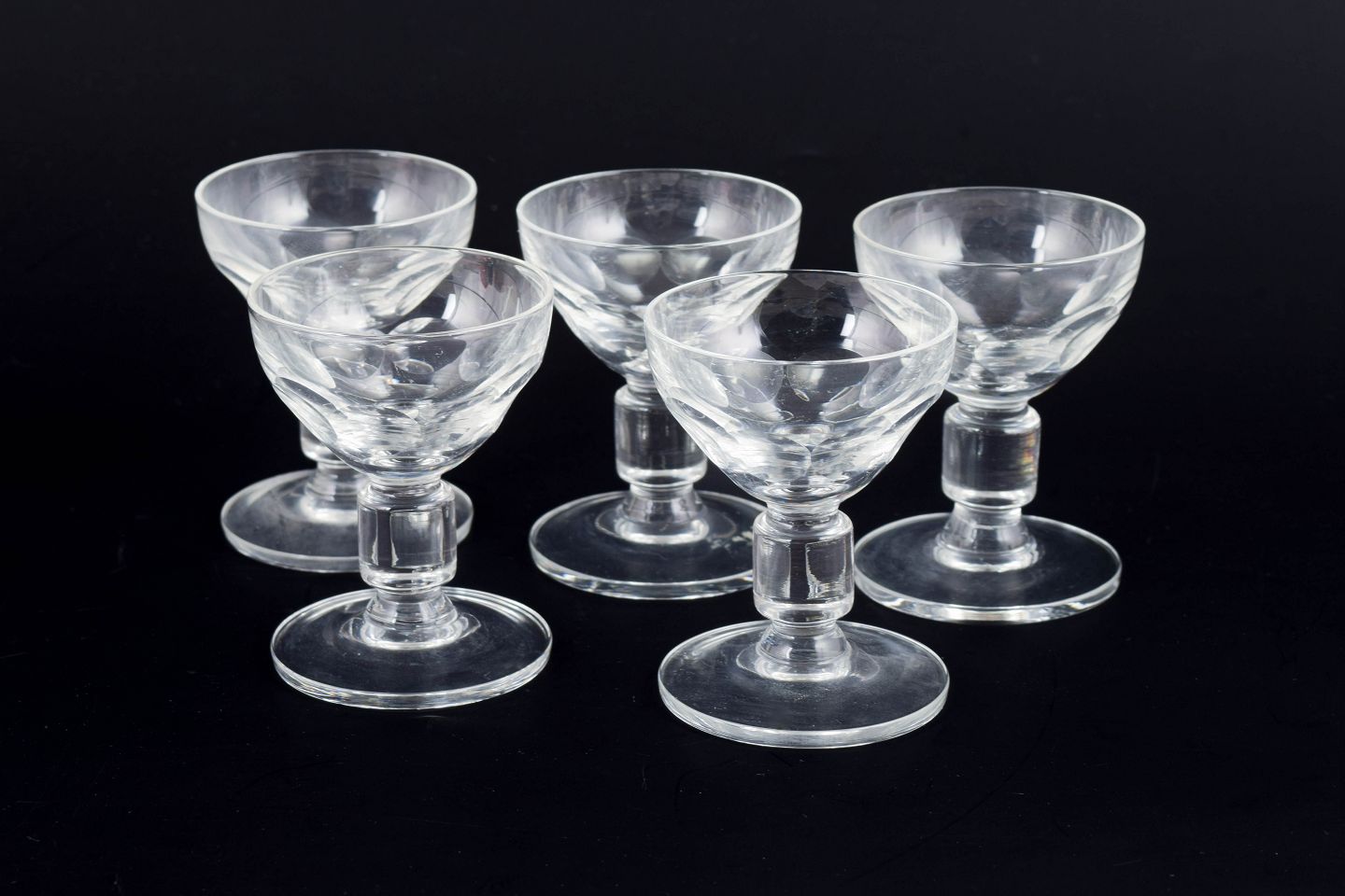 Sæt med 5 små facetslebne snapseglas i klart krystalglas med kraftig fod og skålformet cupe, udført i en klassisk skandinavisk stil. Ca. 1940’erne.