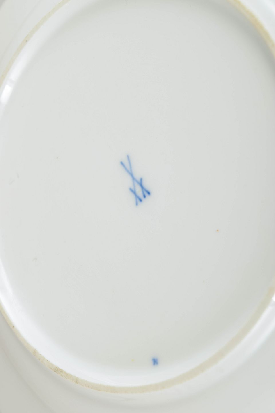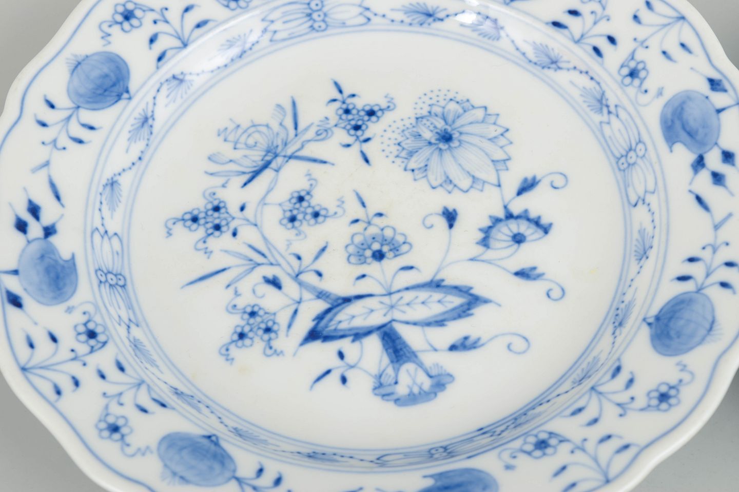 Tallerkener i porcelæn dekoreret med det klassiske blå løgmønster. Annulleret med to indridsede linjer. Mærket i bunden med Meissens krydsede sværd.