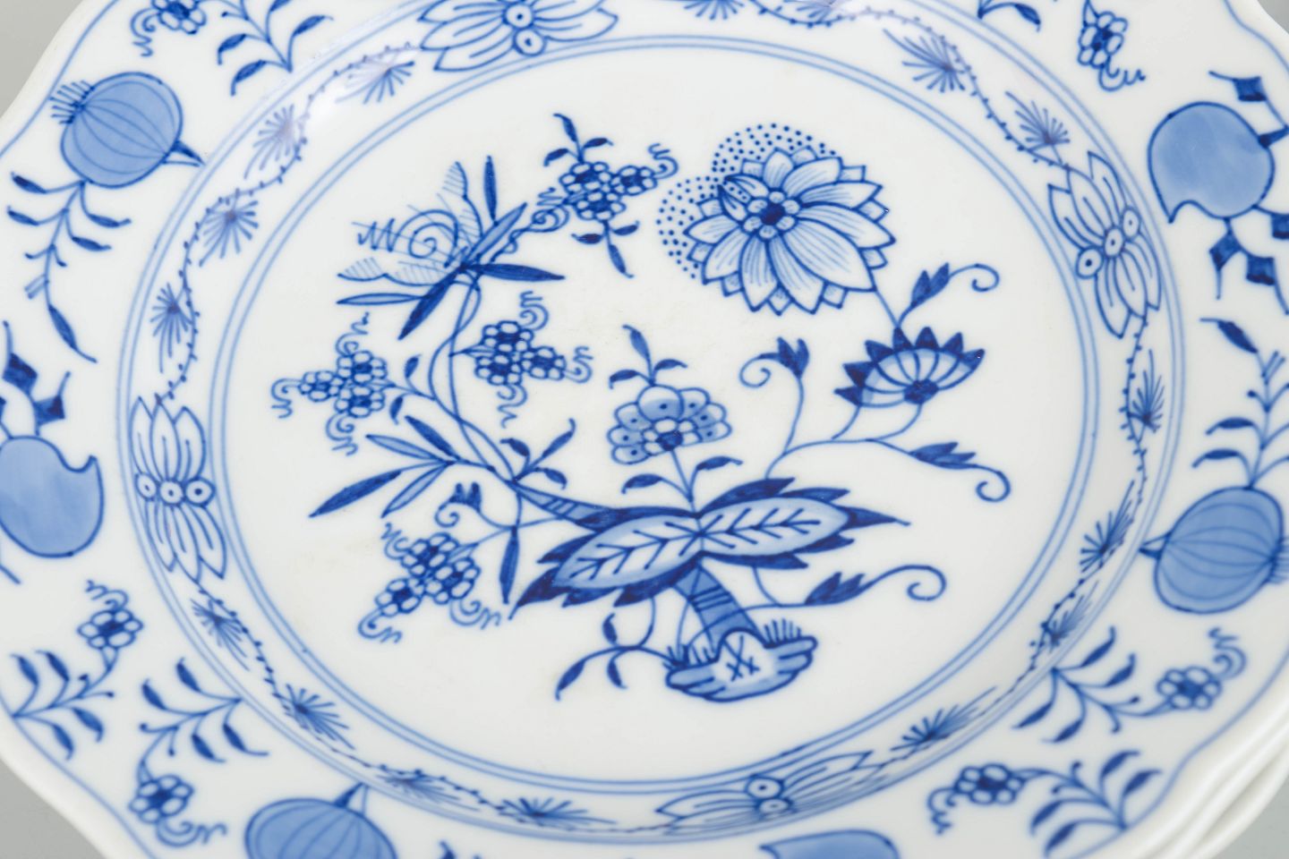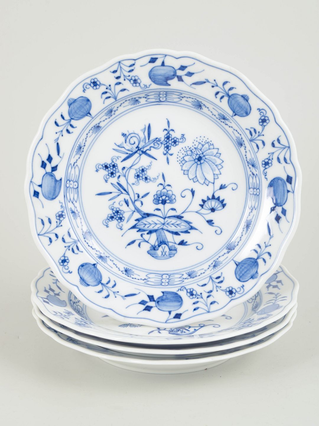 Text zugänglich auf Dänische: Meissen, Blå løgmønster, sæt på fire tallerkener.