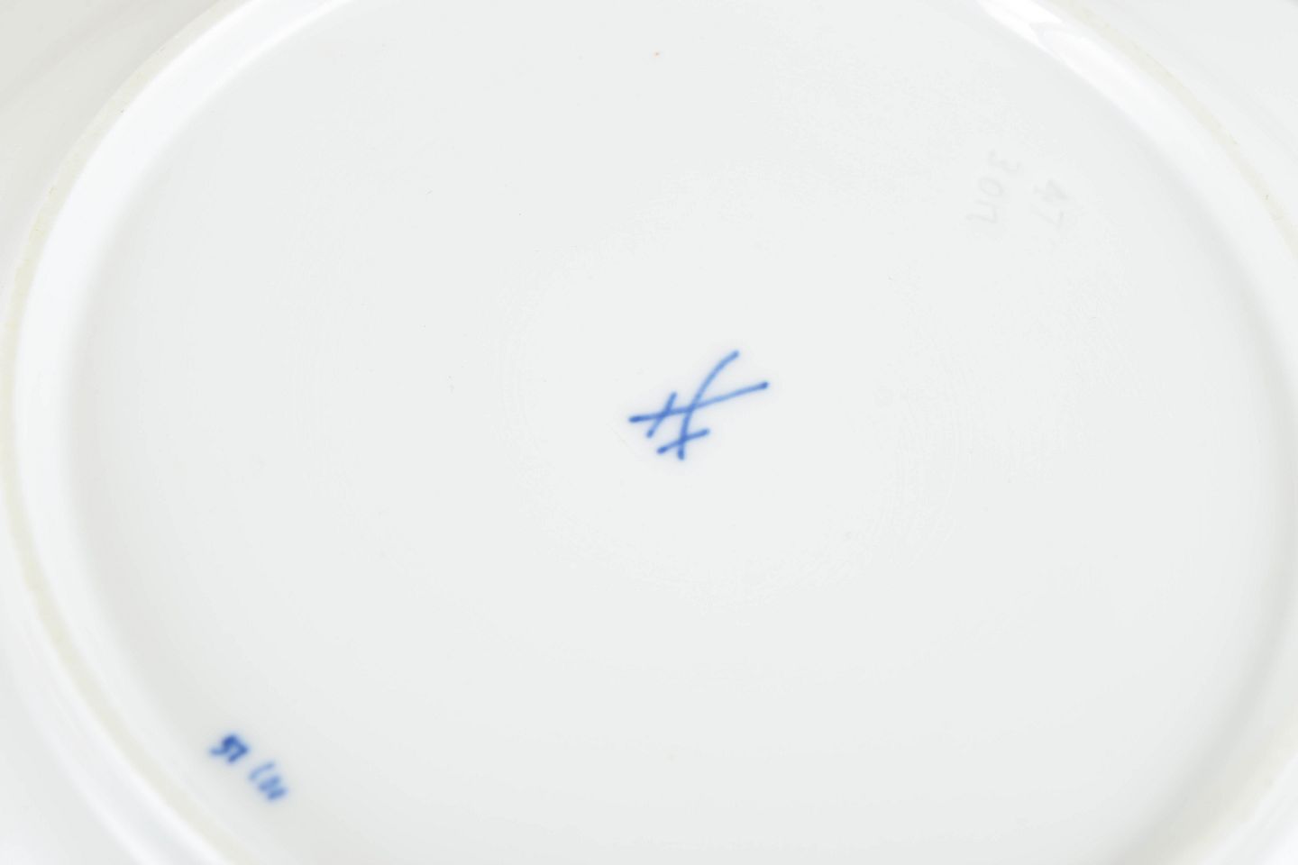 Nogle i første fabrikskvalitet, andre annulleret med én indridset linje. Mærket i bunden med Meissens krydsede sværd.