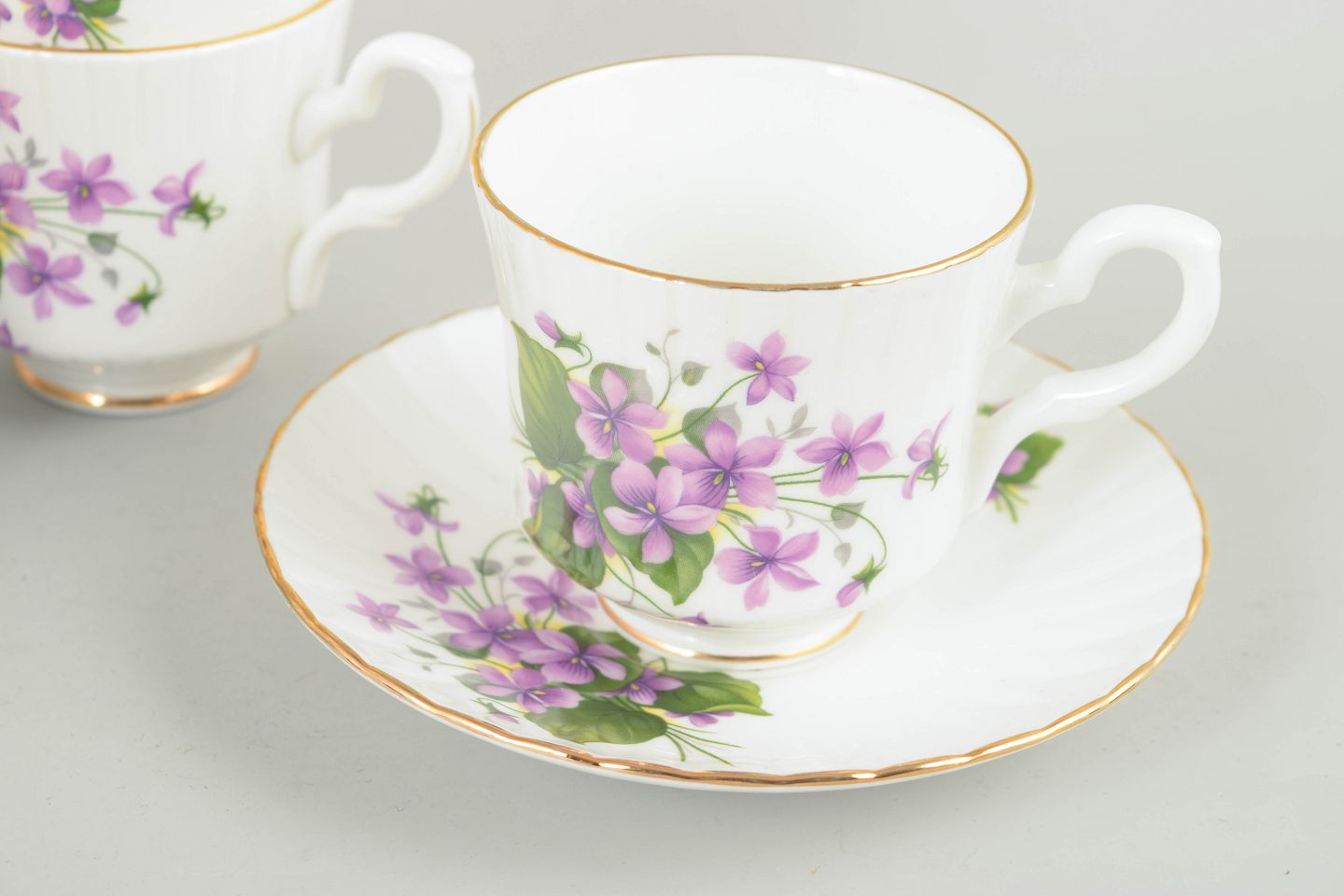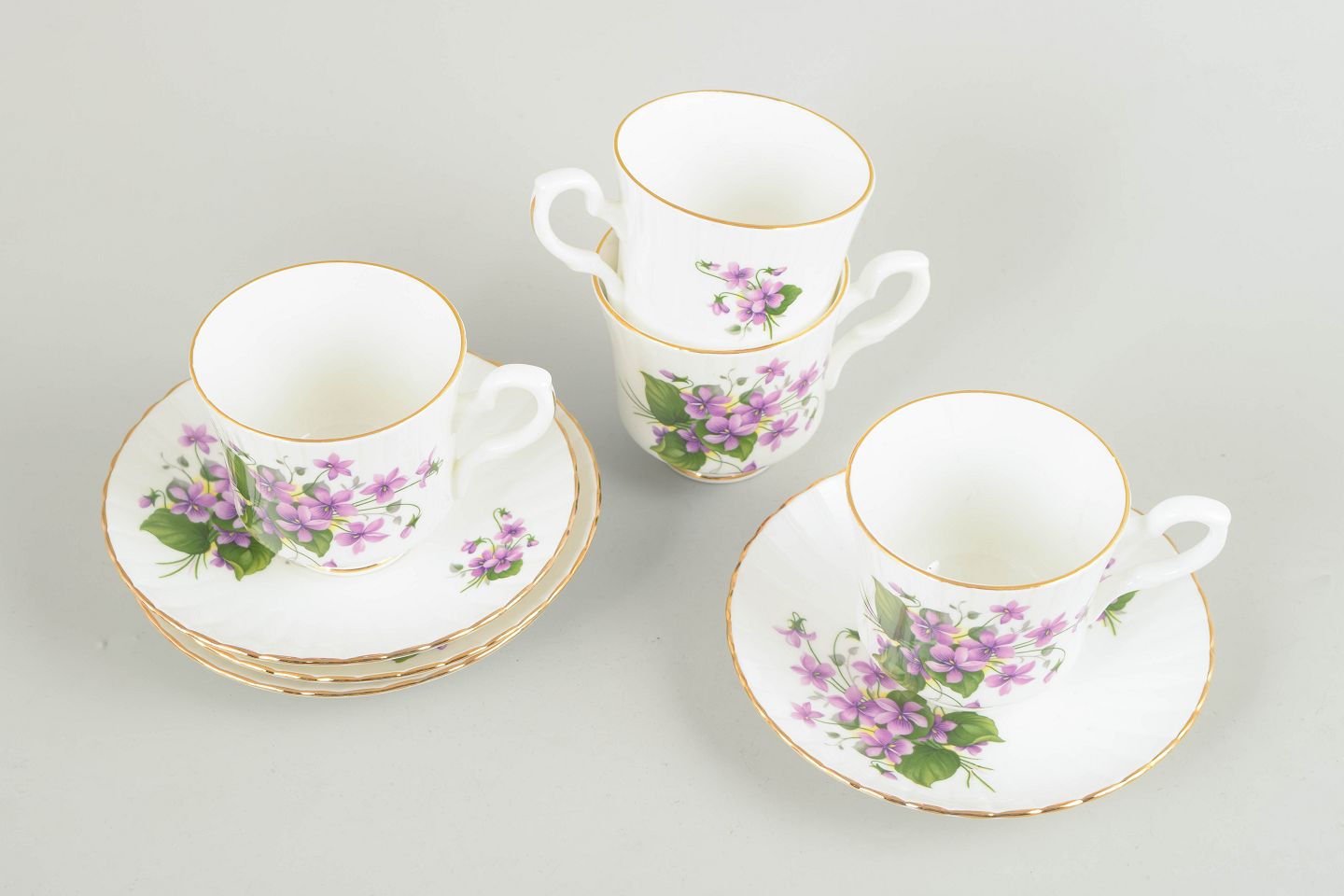 Sæt på fire kaffekopper og tilhørende underkopper i benporcelæn, dekoreret med violette blomster og grønne blade samt guldkant. Fremstillet af Royal Stafford, England.