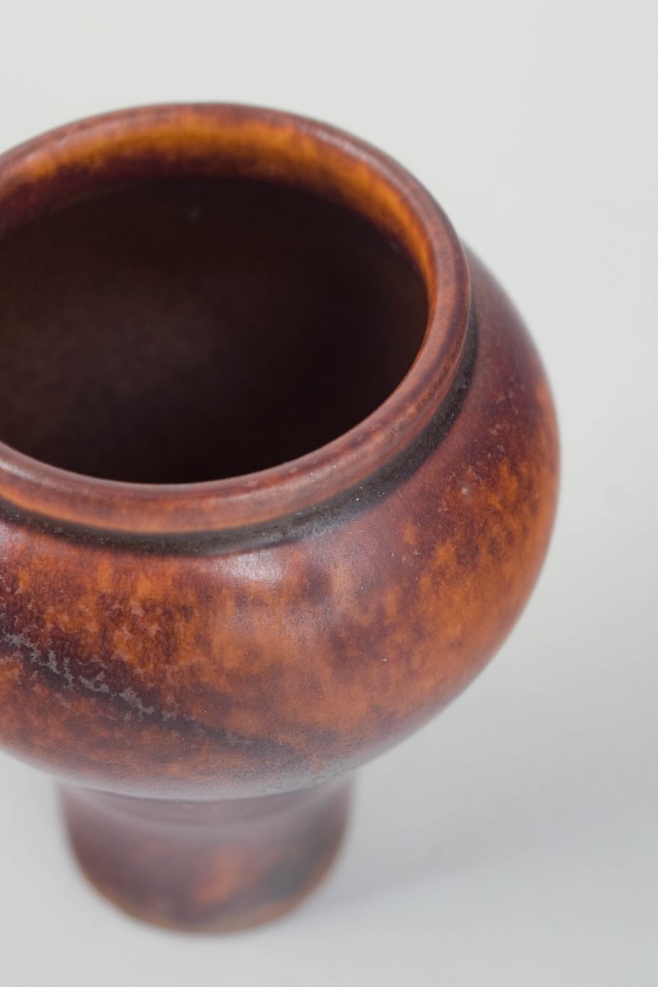 Lille hånddrejet miniaturevase i stentøj med varm brunlig glasur med let nuanceret overflade. Signeret i bunden.
