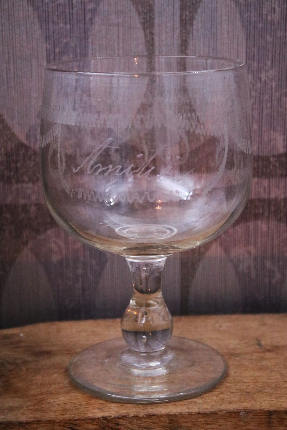 STORT antikt fransk mundblæst Souvenir glas med skrift "Amitie" som betyder Venskab.