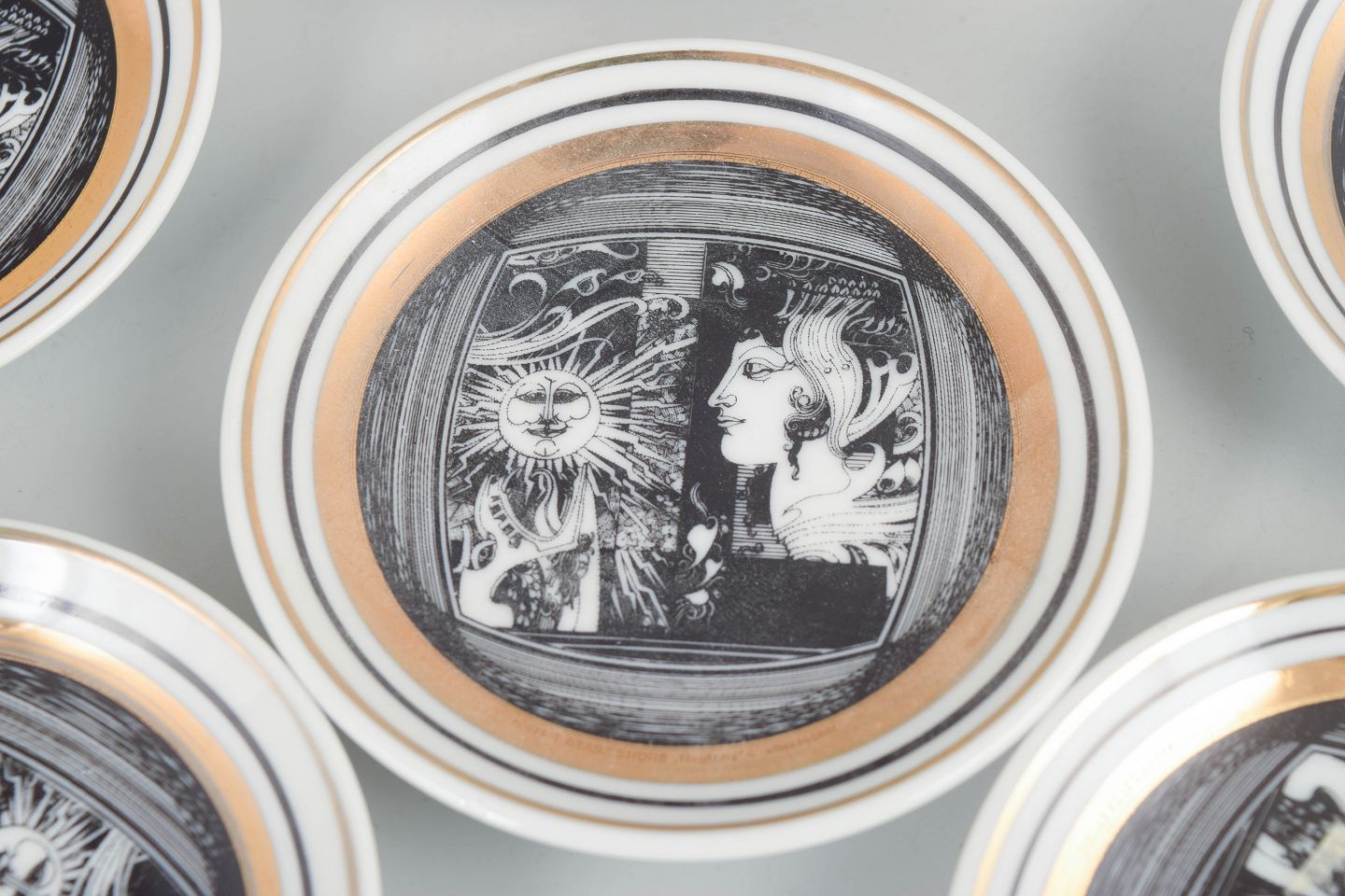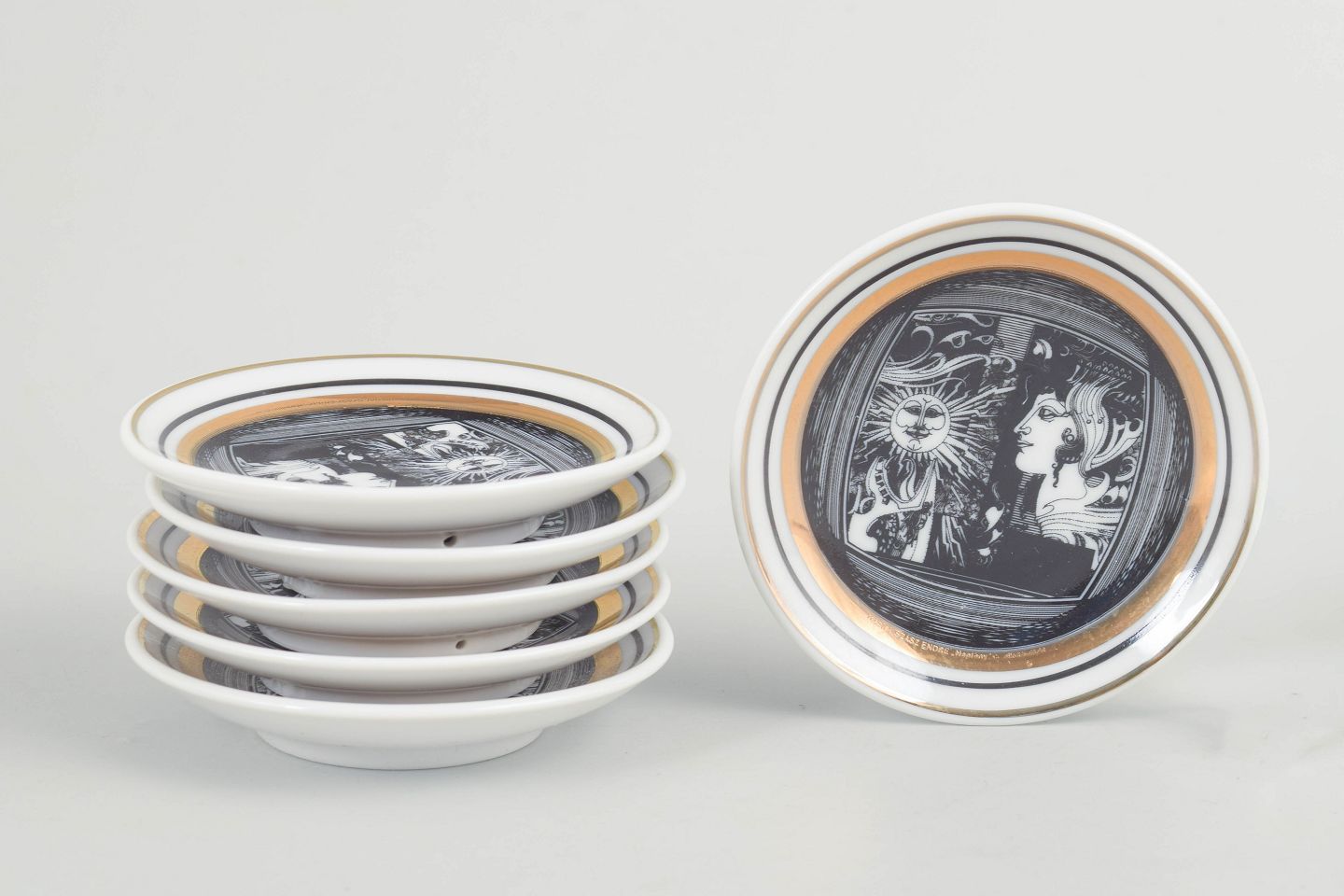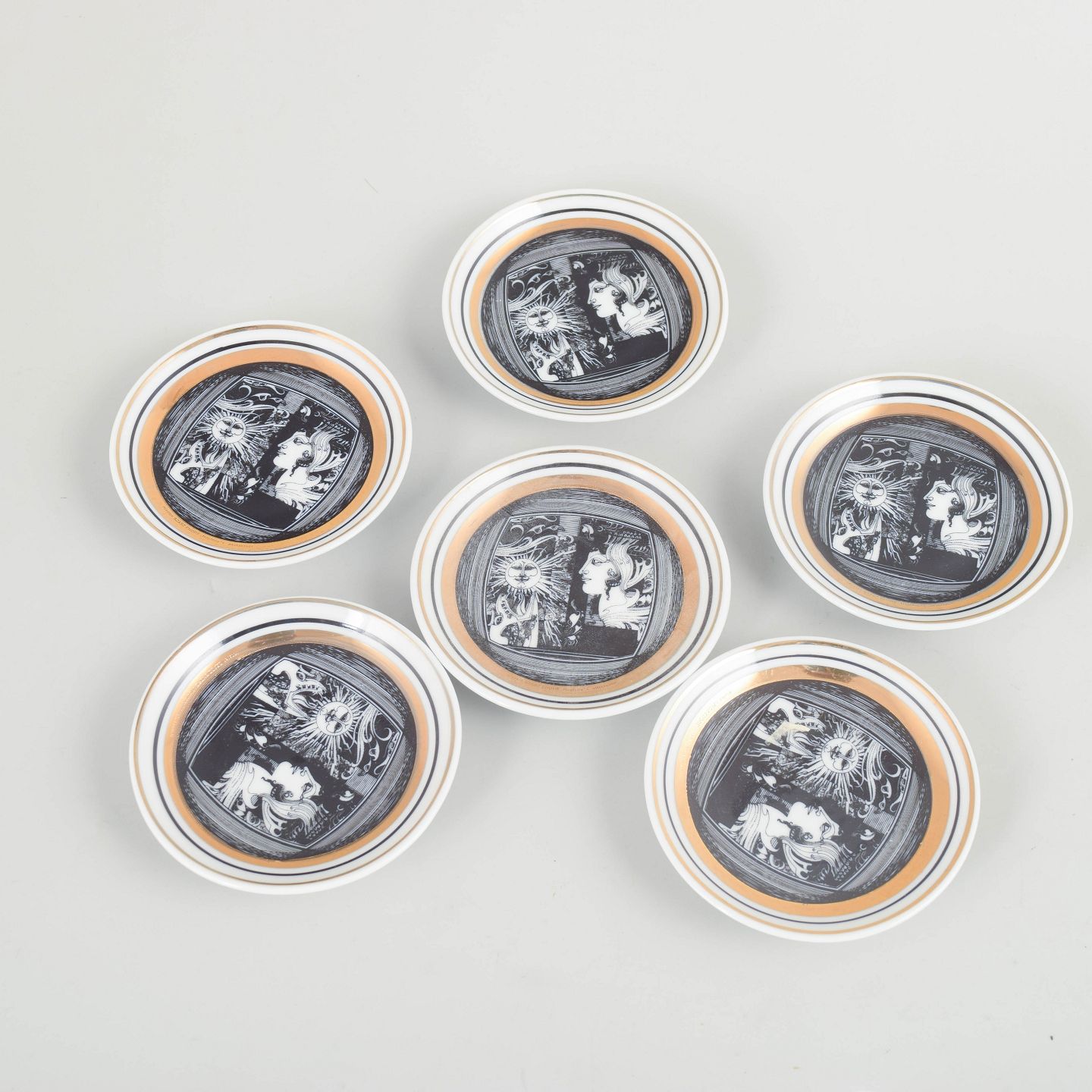 Sæt på seks runde flaskebakker i porcelæn med sort og hvid grafisk dekoration samt gulddetaljer. Fremstillet i begrænset udgave.