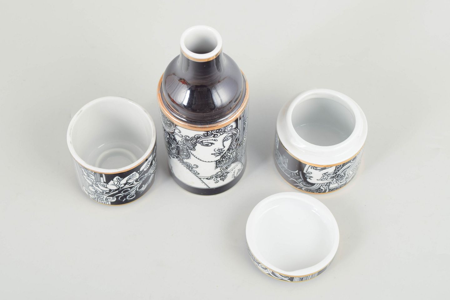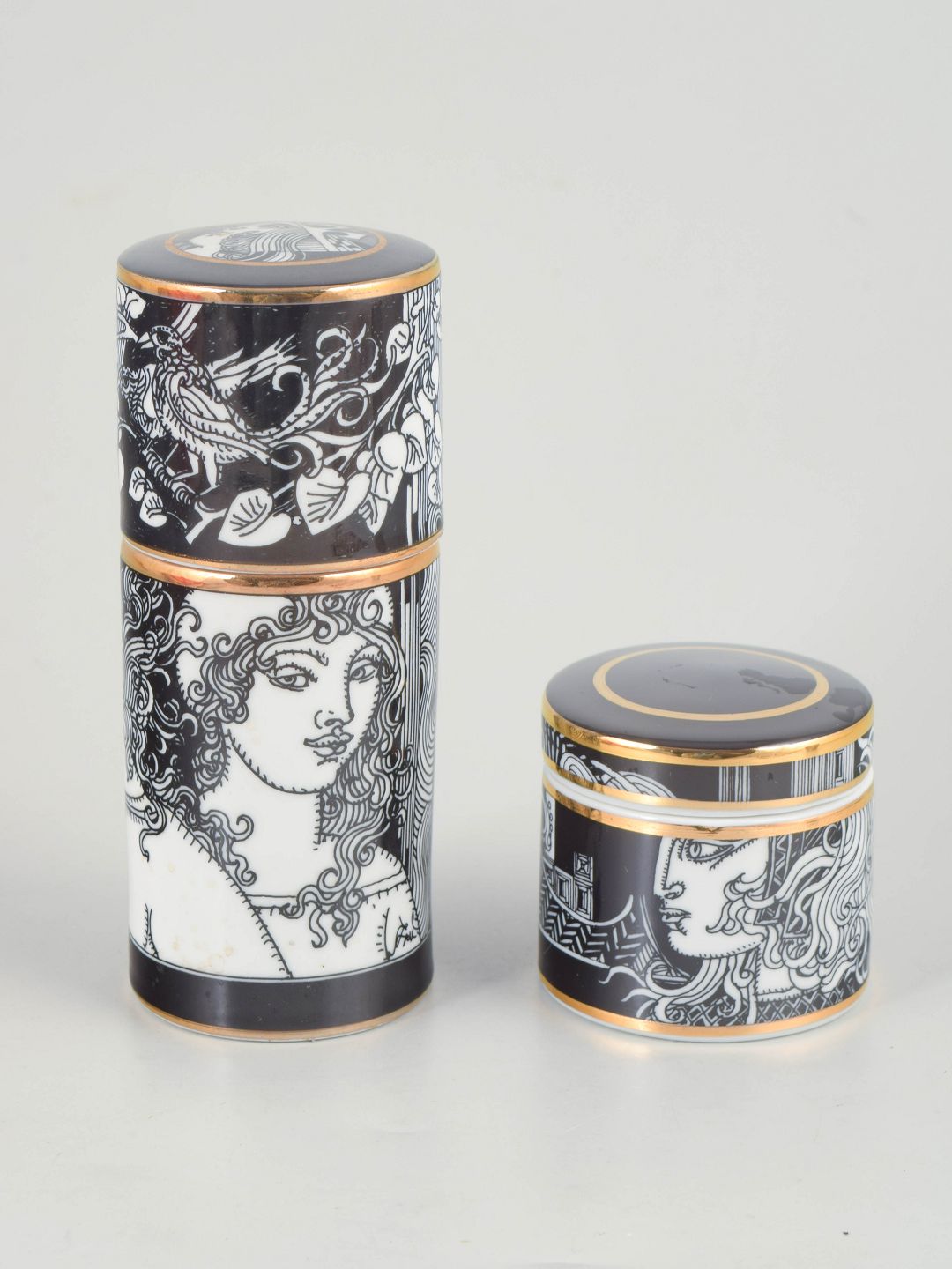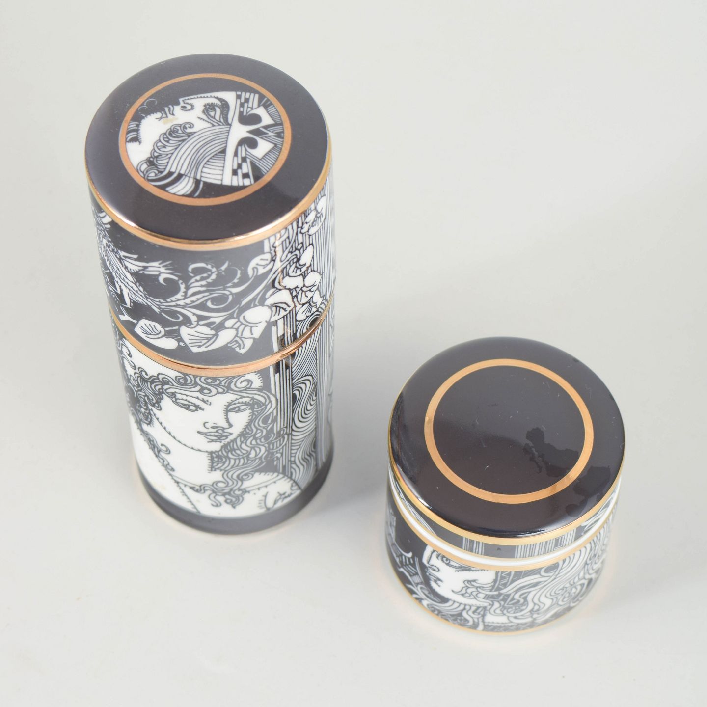 To cylindriske lågkrukker i porcelæn med sort og hvid grafisk dekoration samt gulddetaljer. Produceret i begrænset udgave.