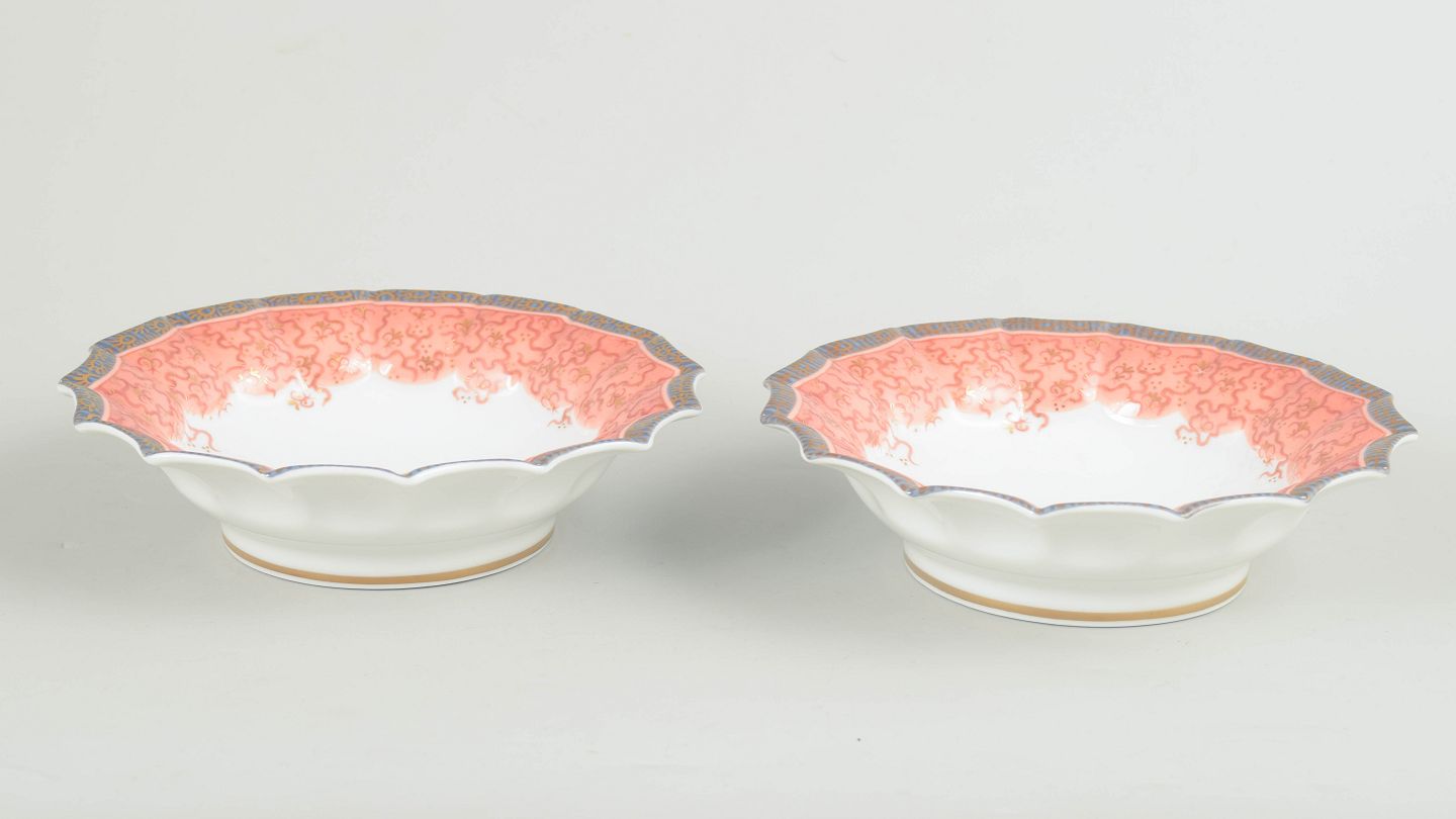 To lave skåle i hvidt porcelæn dekoreret med Fairytale-mønster i bløde rosa toner langs den bølgede kant. 1. sortering. Model 351.