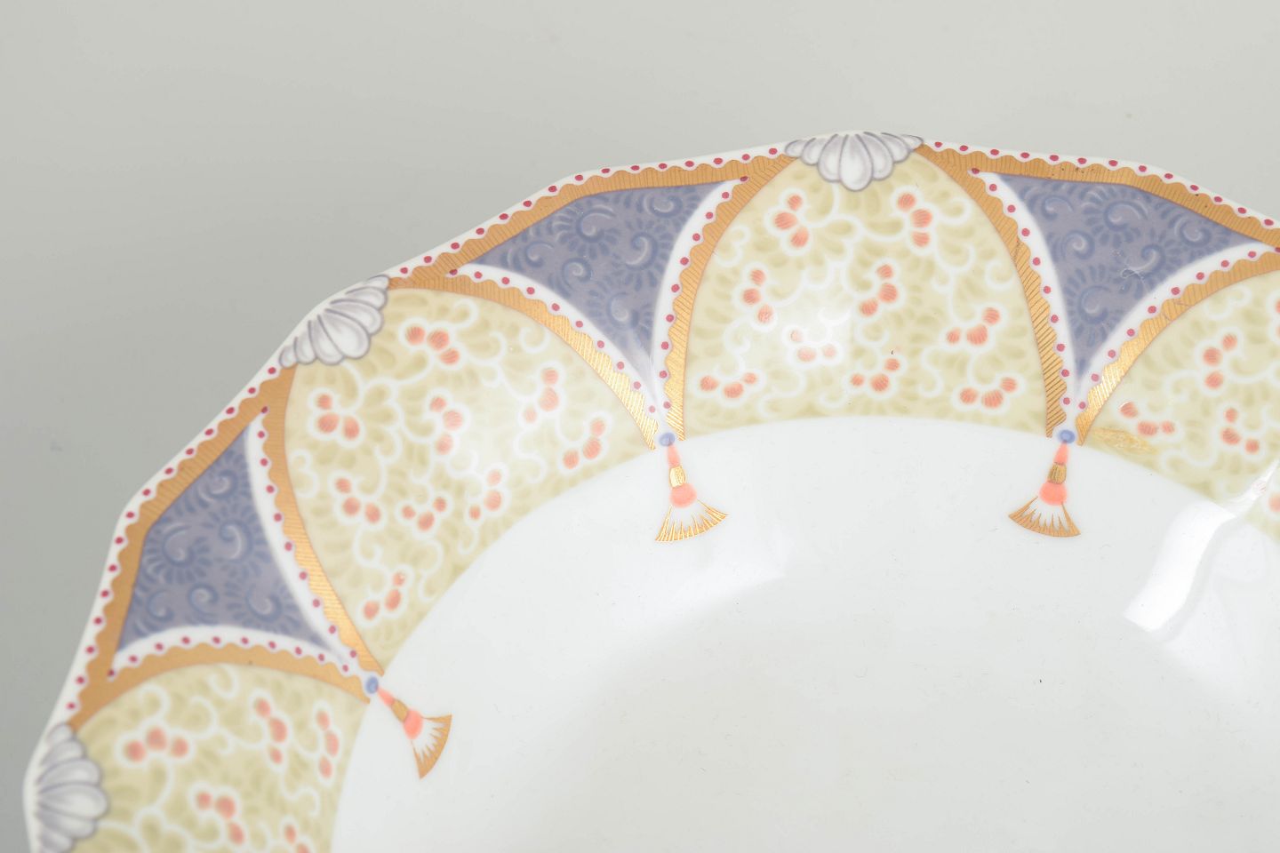 Stor opsats i hvidt porcelæn med fod, dekoreret med Fairytale-mønster i bløde rosa, gyldne og blå toner langs kanten. Fremstillet i perioden 1992–1999 i 1. sortering. Model 577.