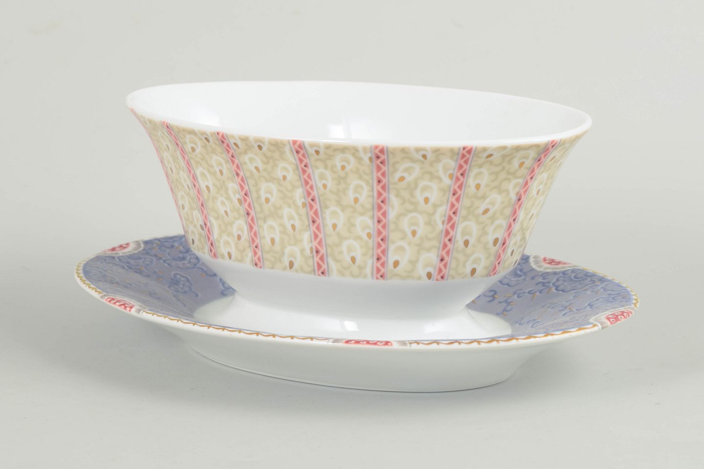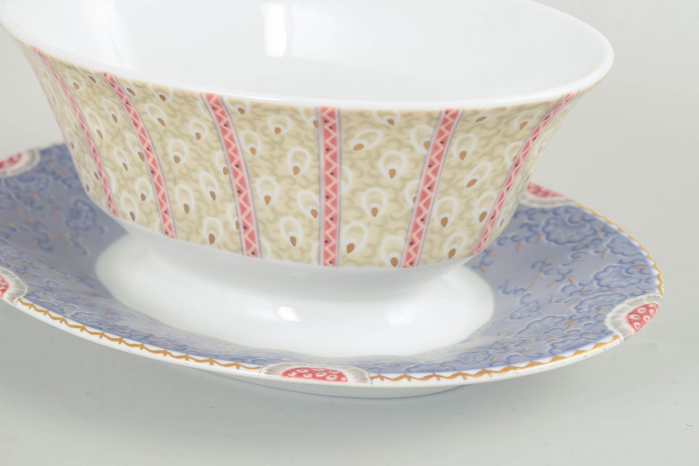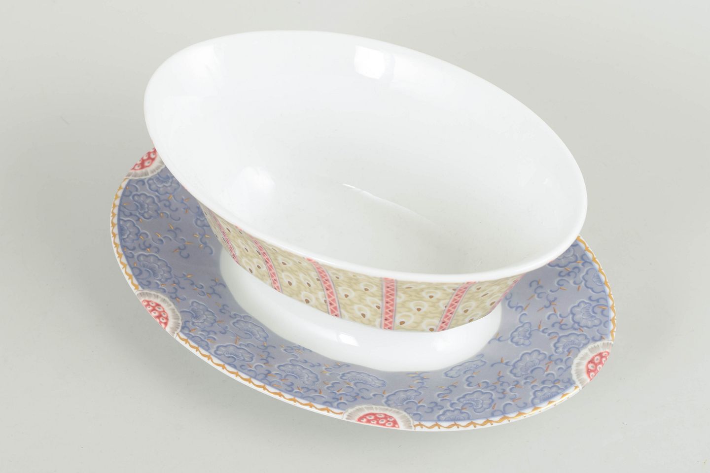 Elegant saucekande i hvidt porcelæn dekoreret med Fairytale-mønstre i bløde pastelfarver og fine detaljer. Modellen er fremstillet i perioden 1992–1999 og er udført i 1. sortering.