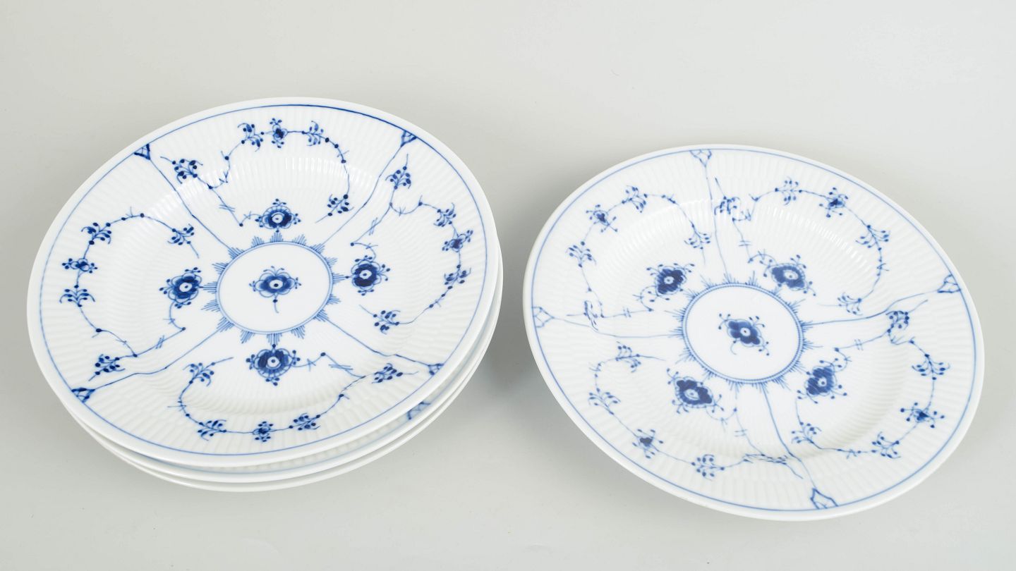 Royal Copenhagen, Musselmalet riflet, sæt på 4 middagstallerkener.