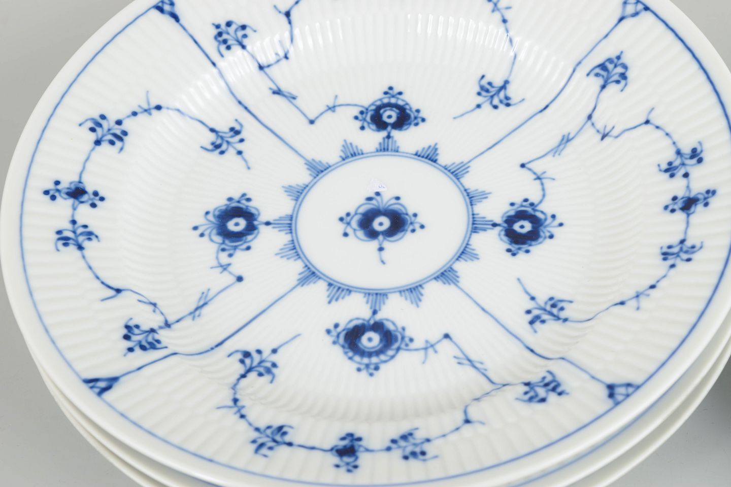 Sæt på 4 middagstallerkener i hvidt porcelæn med håndmalet koboltblå musselmalet riflet dekoration. Model 1/575.