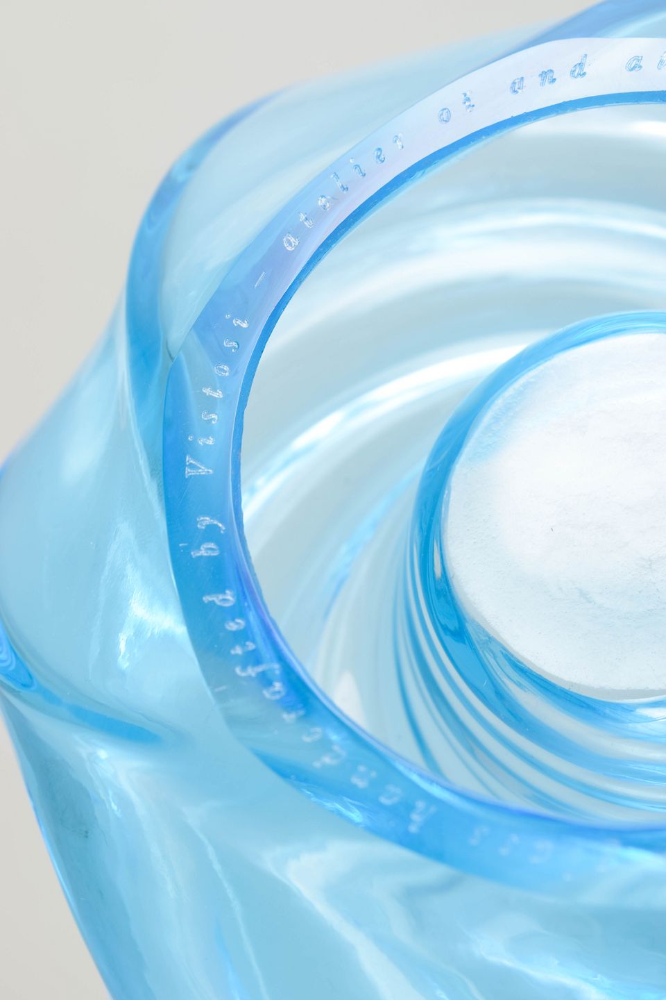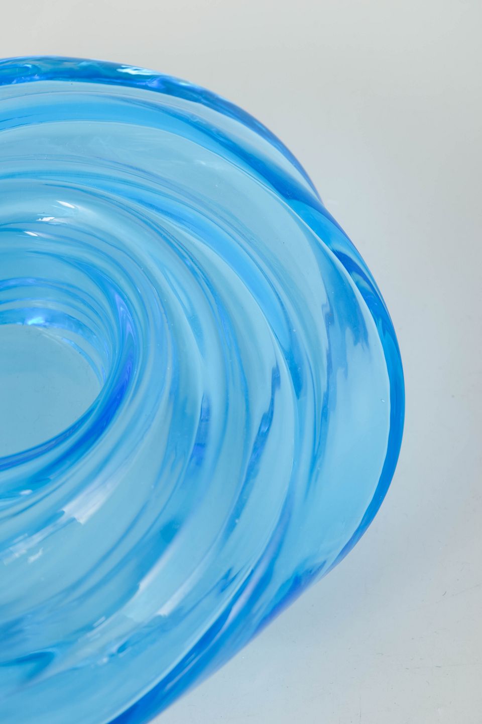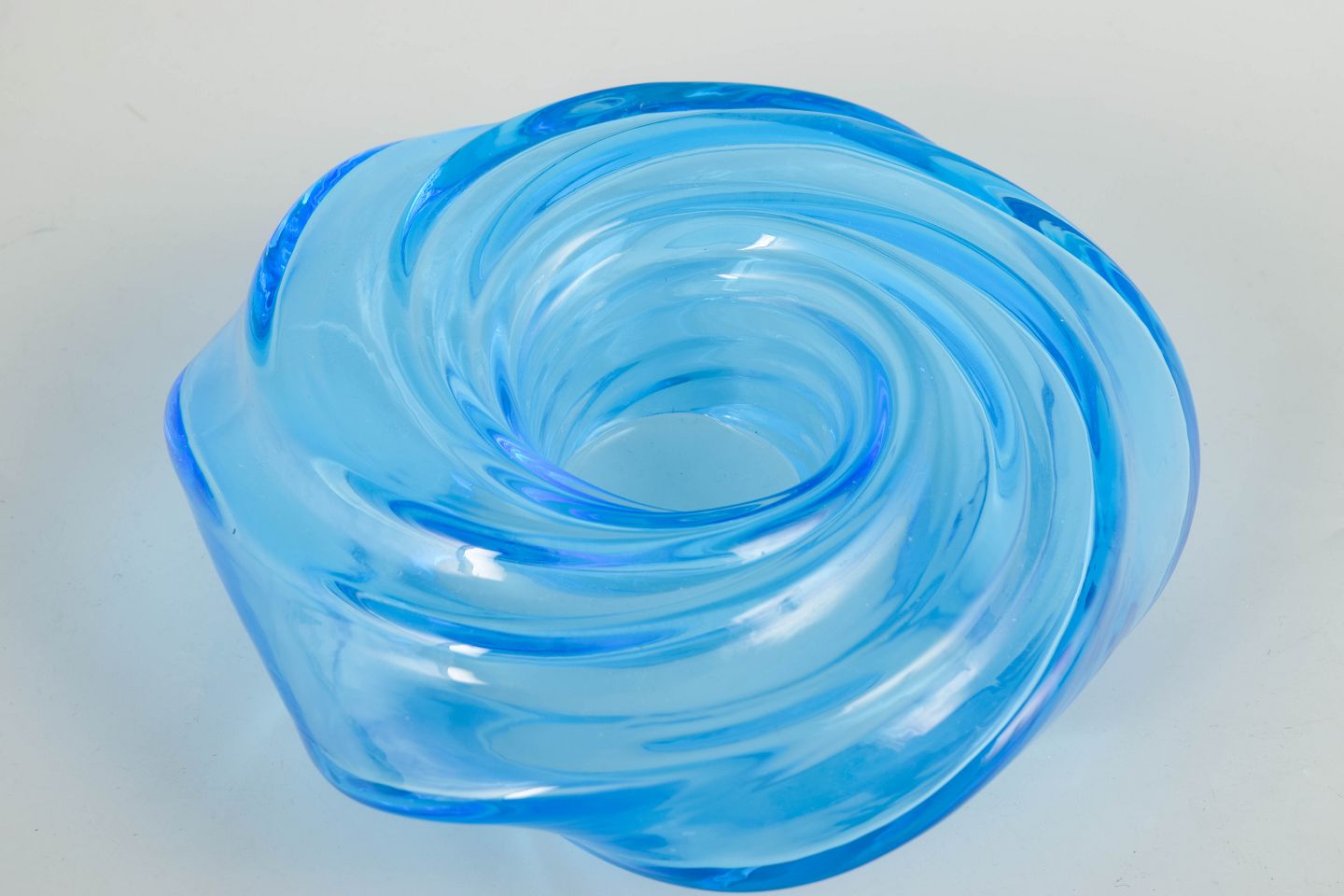 Skulpturel skål i klart blåt mundblæst glas med spiralformet bevægelse og bløde, bølgende linjer.