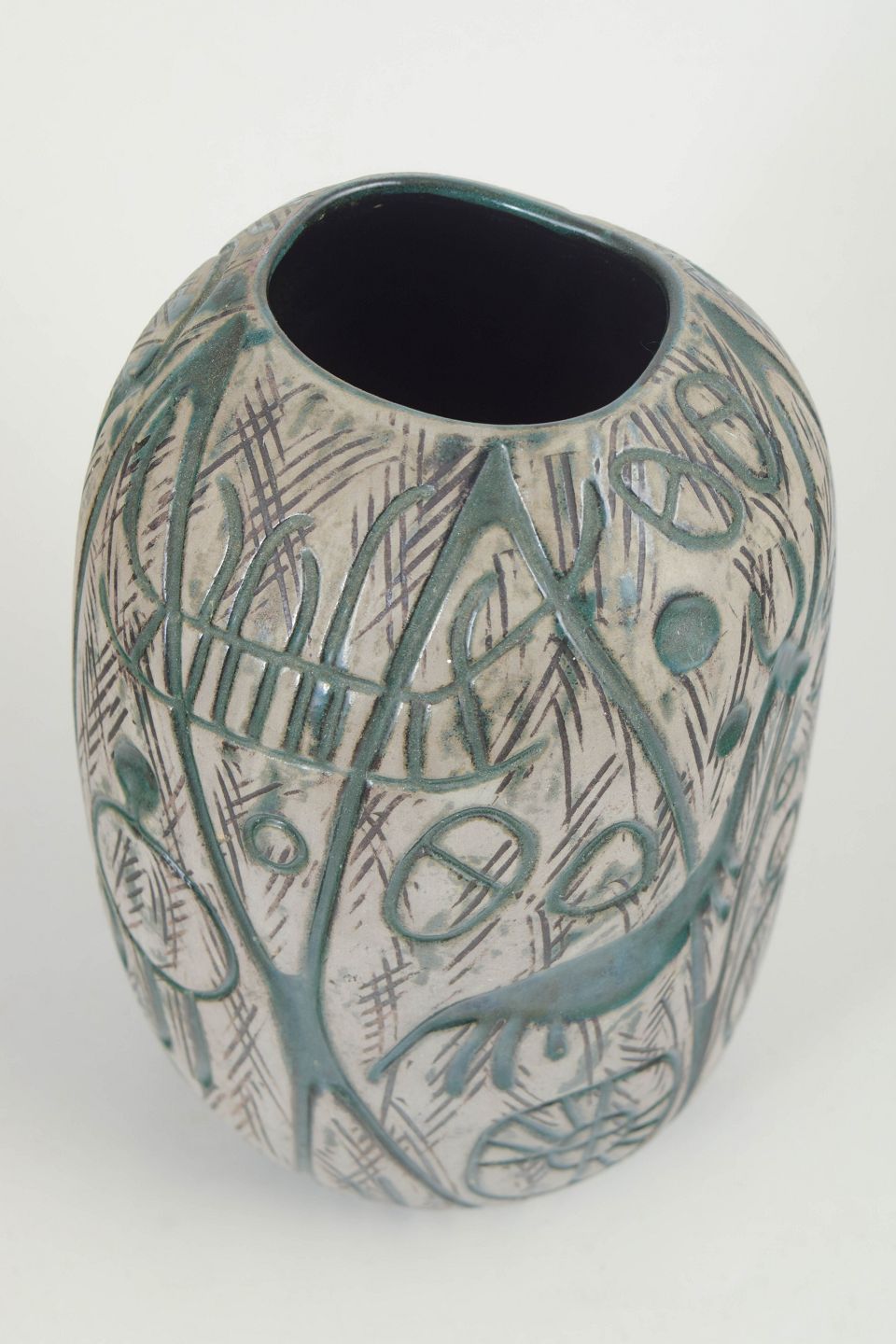 Dekorativ stentøjsvase med karakteristisk reliefdekoration i grønne og grå nuancer. Vasen er udført i serien Hedenhös og er formgivet med organiske linjer og indridset mønster. Model 4305.