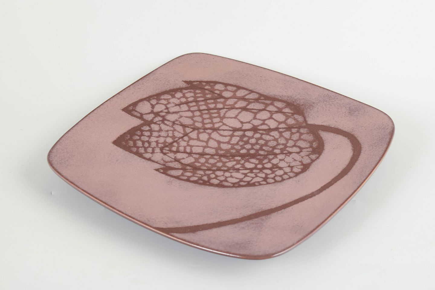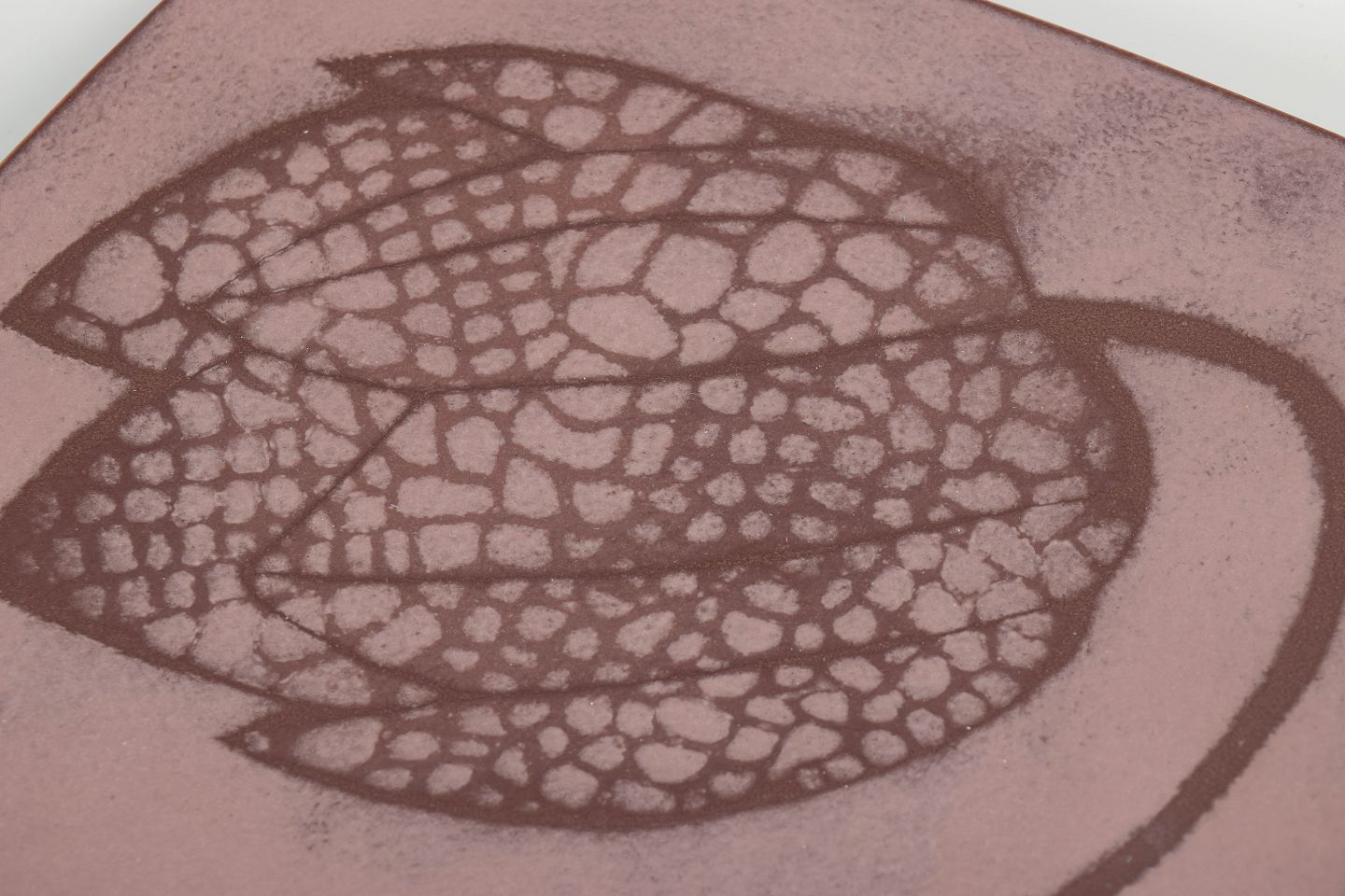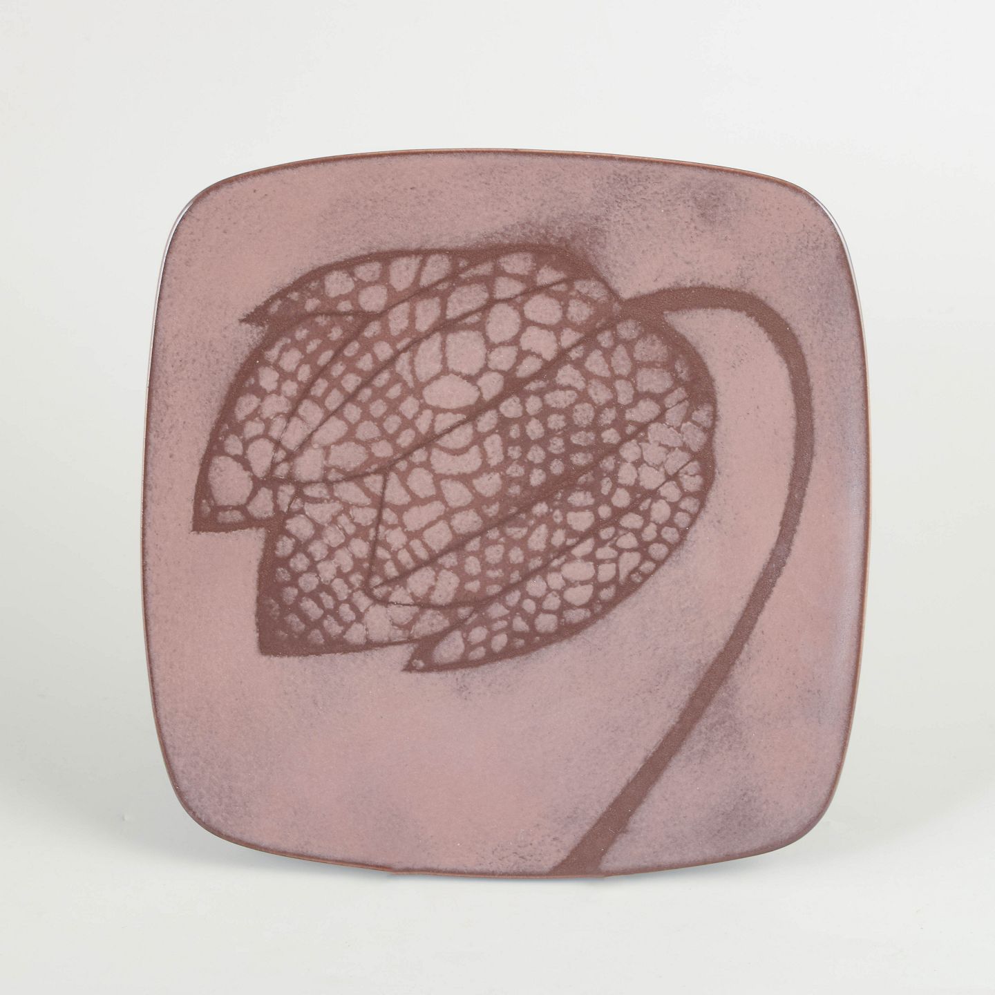 Kvadratisk fad i stentøj med afdæmpet rosa glasur og stiliseret bladmønster i mørkere toner. Signeret Ann Pentik på undersiden. Unikt arbejde fra Pentik Studio.