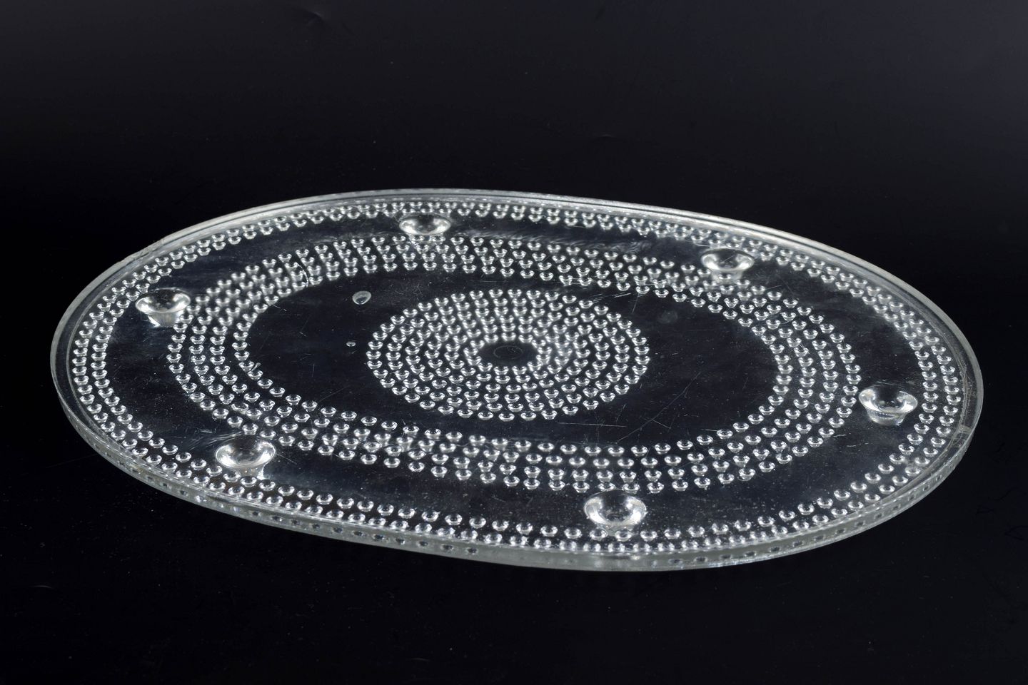 Stor oval bakke i klart kunstglas med koncentriske cirkler af knoprelief og ophøjede fødder. Fremstillet i presset glas.