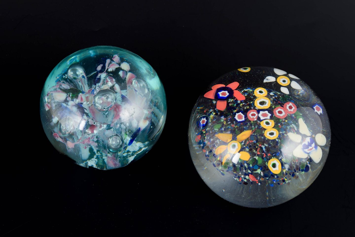 To Kugleformede brevpressere i klart kunstglas med indre farveelementer, herunder lagdelte strukturer, spredte luftbobler og dekorative indlæg i kontrasterende farver. Uden signatur.