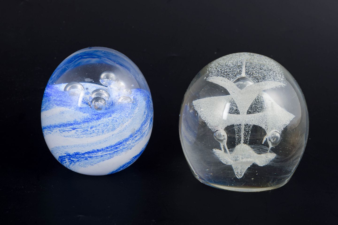Organisk formet brevpresser i klart kunstglas med indre blå og hvide slør samt indkapslede luftbobler. Signeret i bunden “Studio Åhus, NK 1915–1990”.