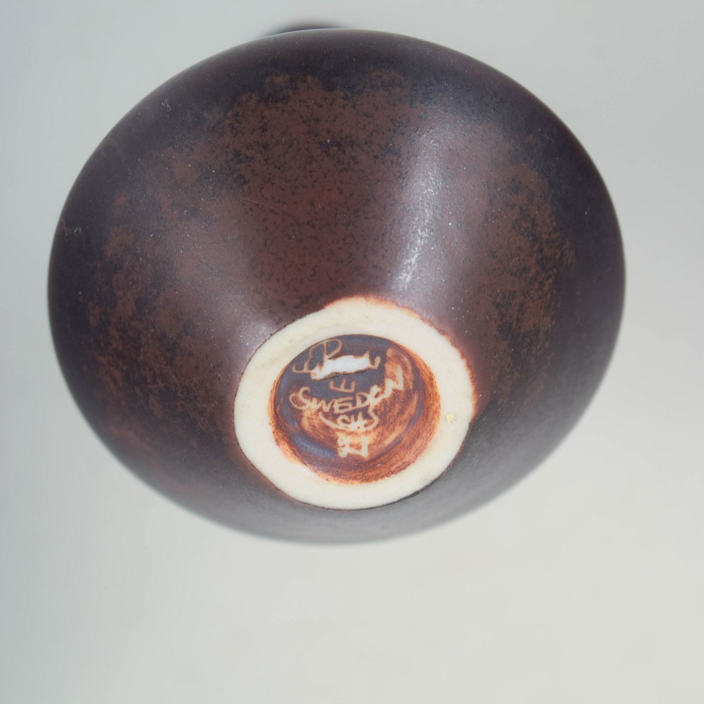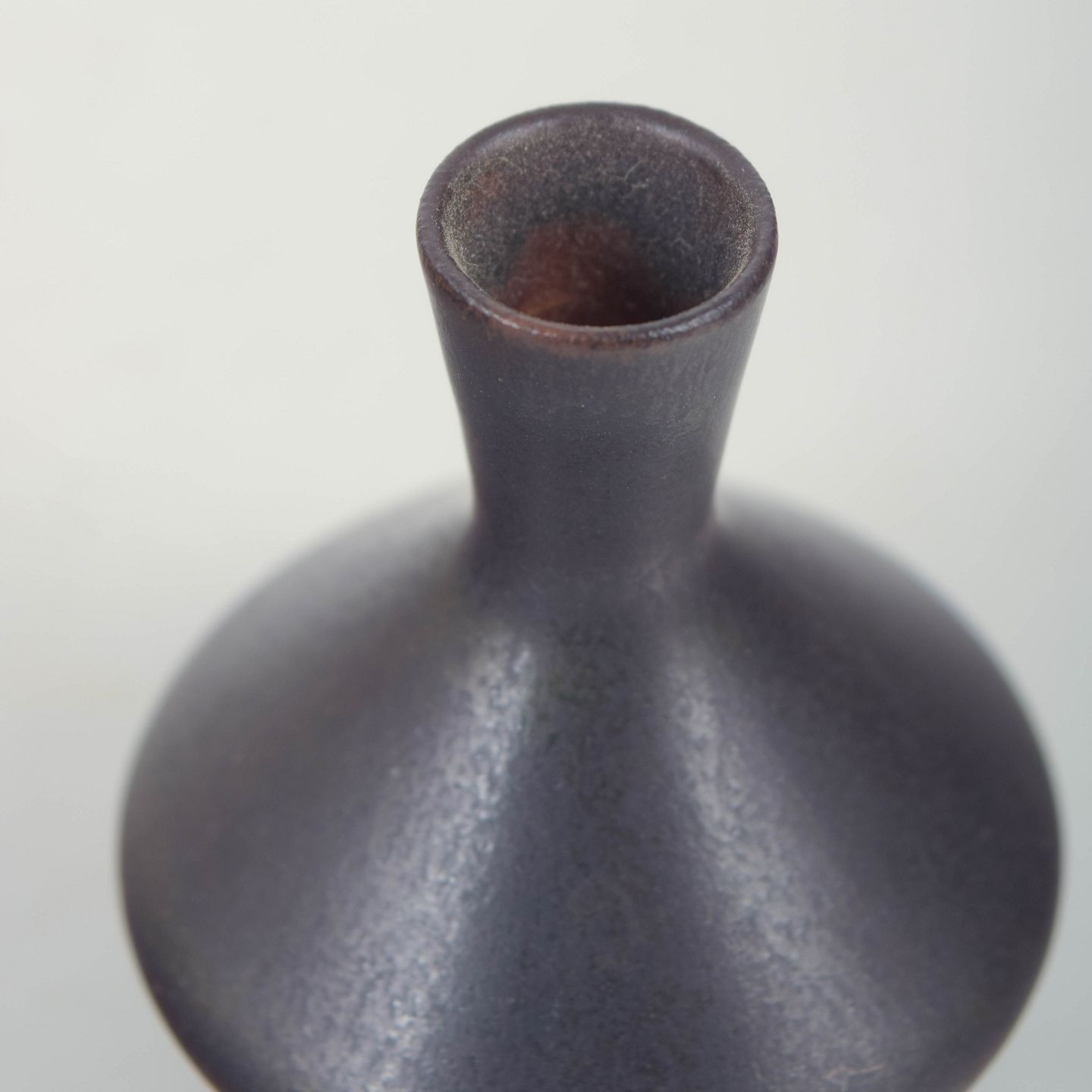 Miniaturevase i stentøj med mat, mørk violetgrå glasur, markant bug og smal, opadtrukket hals. Signeret. Undersiden annulleret med én indridset streg.