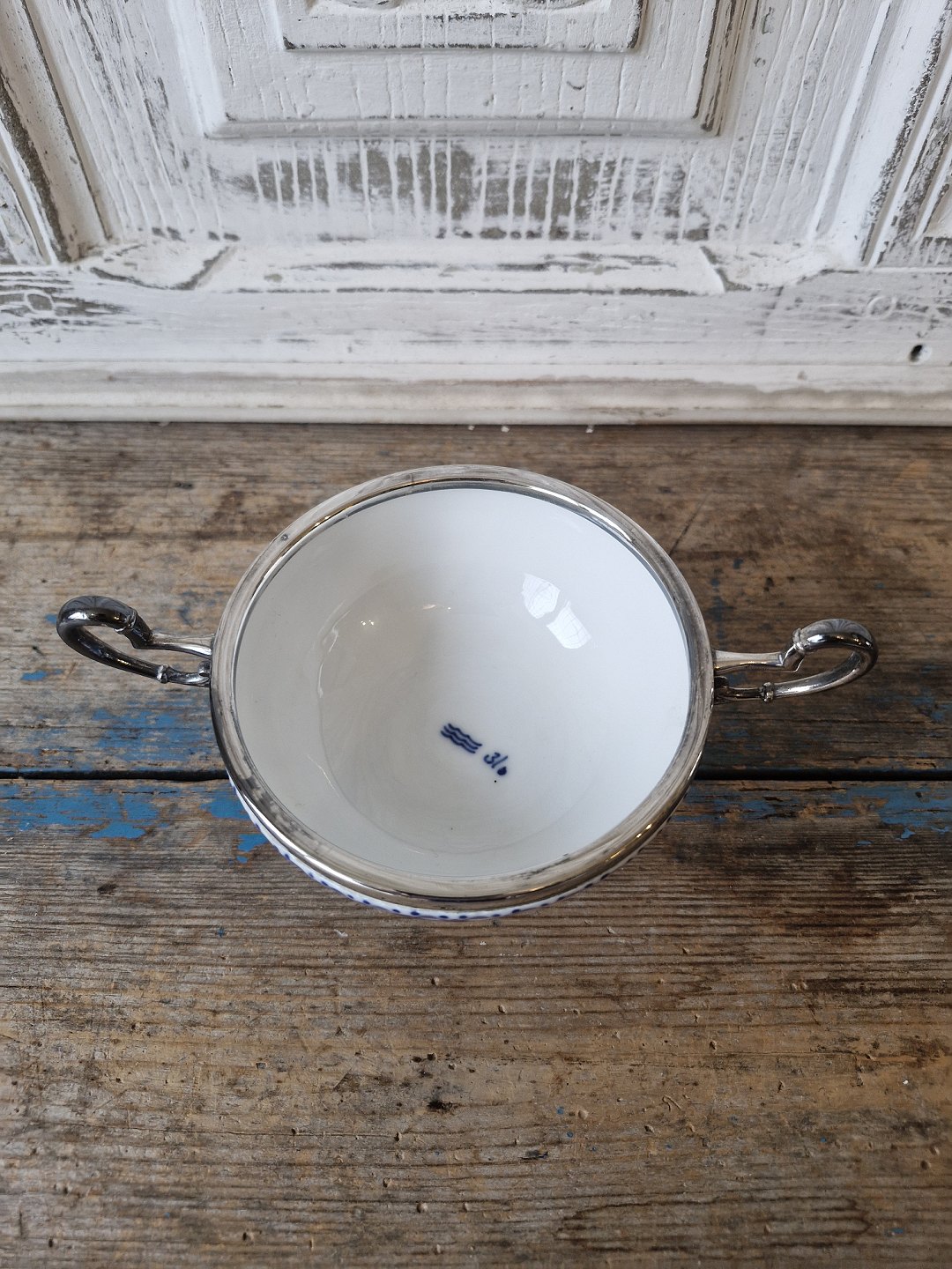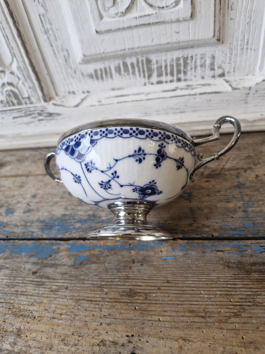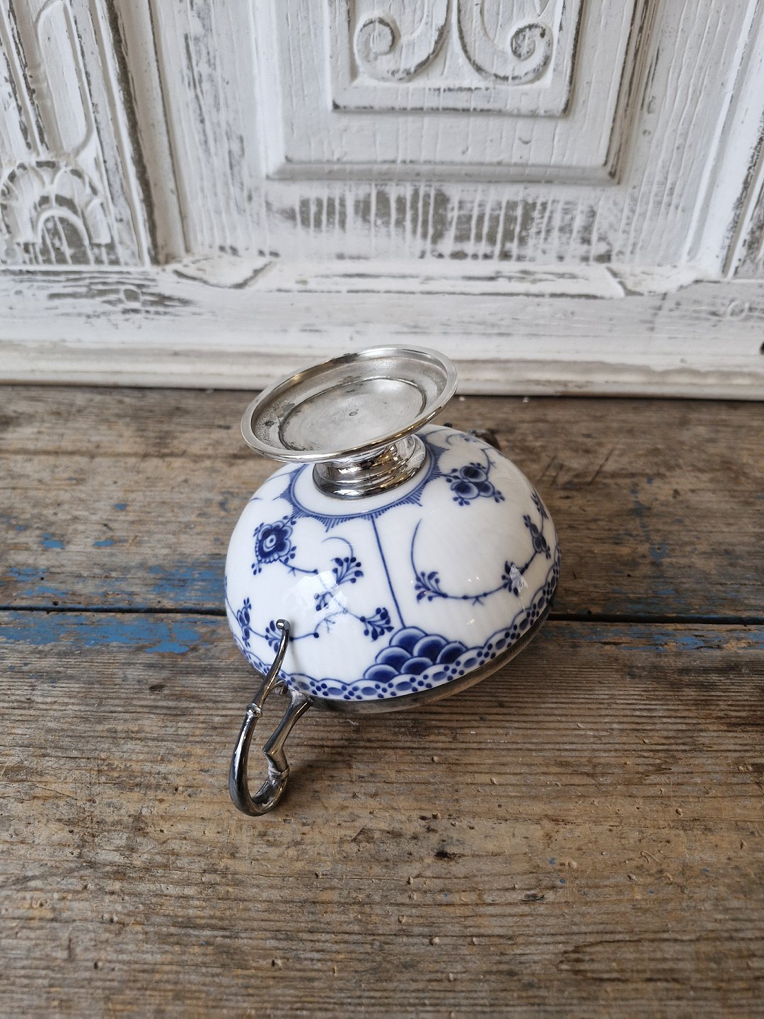 Text zugänglich auf Dänische: Royal Copenhagen Musselmalet halvblonde sukkerskål med forsølvet montering.