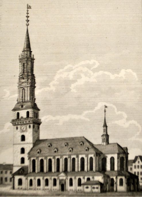 Unbekannter Künstler (18. Jahrhundert): Liebfrauenkirche in Kopenhagen in ihrer älteren Form. Kupferstich. Höhe: 26 cm. Breite: 17 cm.