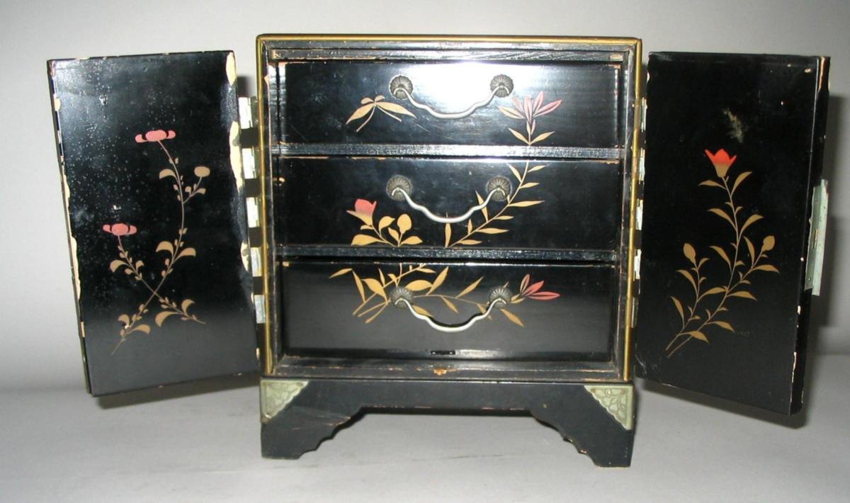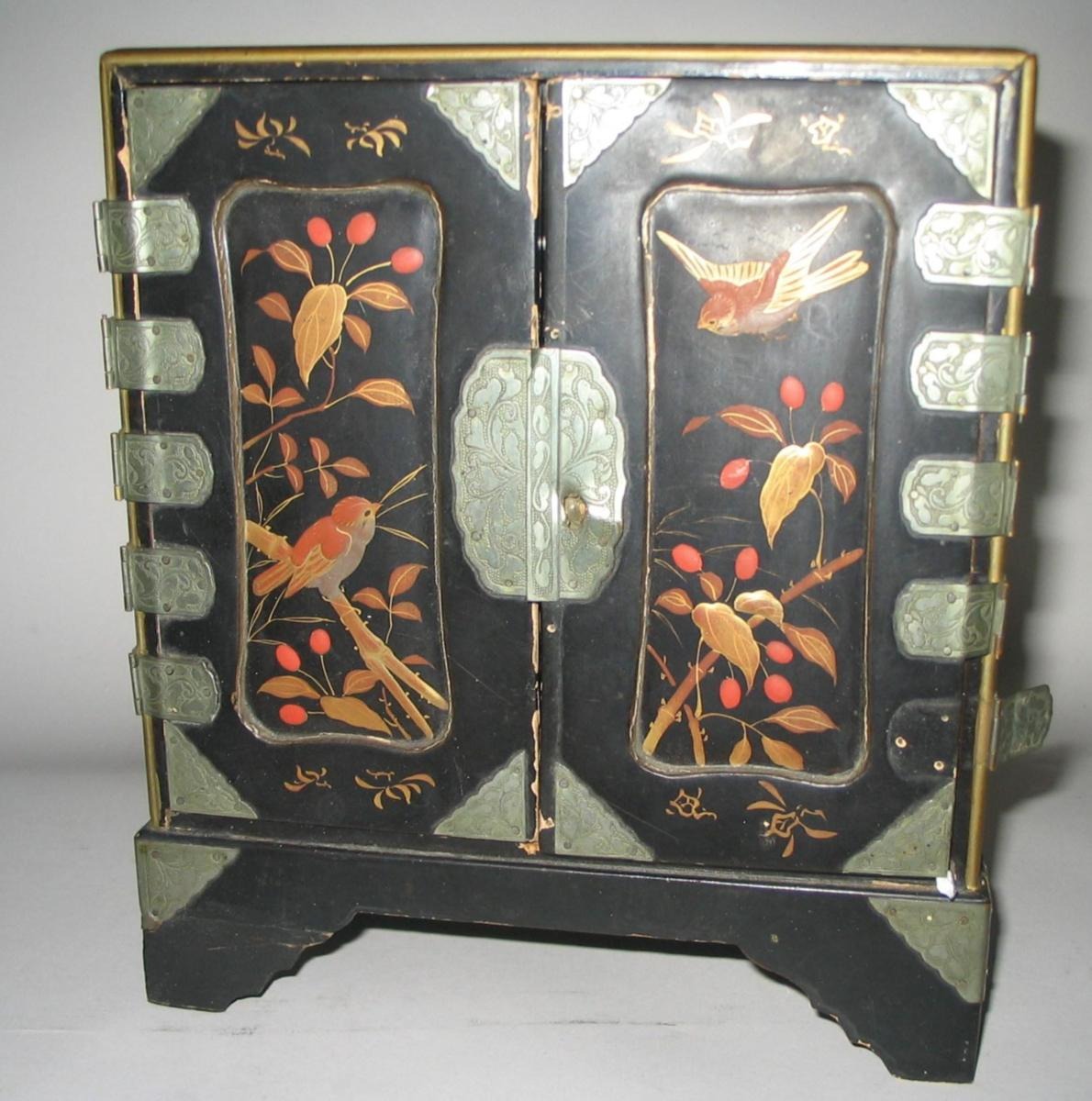 Chinesische Schmuckschatulle aus Lackarbeit mit Vogelmotiven auf beerenbehangenen Zweigen. Zwei Türen, innen drei Schubladen – ebenfalls verziert. Höhe: 21 cm, Tiefe: 11 cm, Breite: 19 cm. Leichte Gebrauchsspuren.