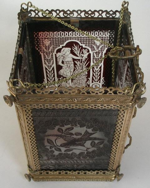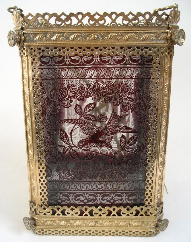 Ampel, Deutschland, ca.1880. In durchstochene Messing mit Dekorationen in Form von Rosen, abgewalmene Ecken und Knospen. Afgehängt in eine Kette. Seiten in Form von Klarglas. Mit  Auflagdekoration in Rot, mit einer junge Frau in einem Garten und ein Vogel auf einem Zweig. Der Boden aus klaren Glas. H:. 30 cm. B:. 21 cm.