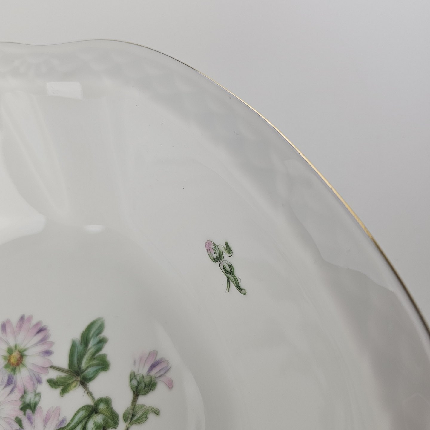 Krysantemum er hvidt porcelæn dekoreret med lys lilla blomst, grønne blade og guldkant.