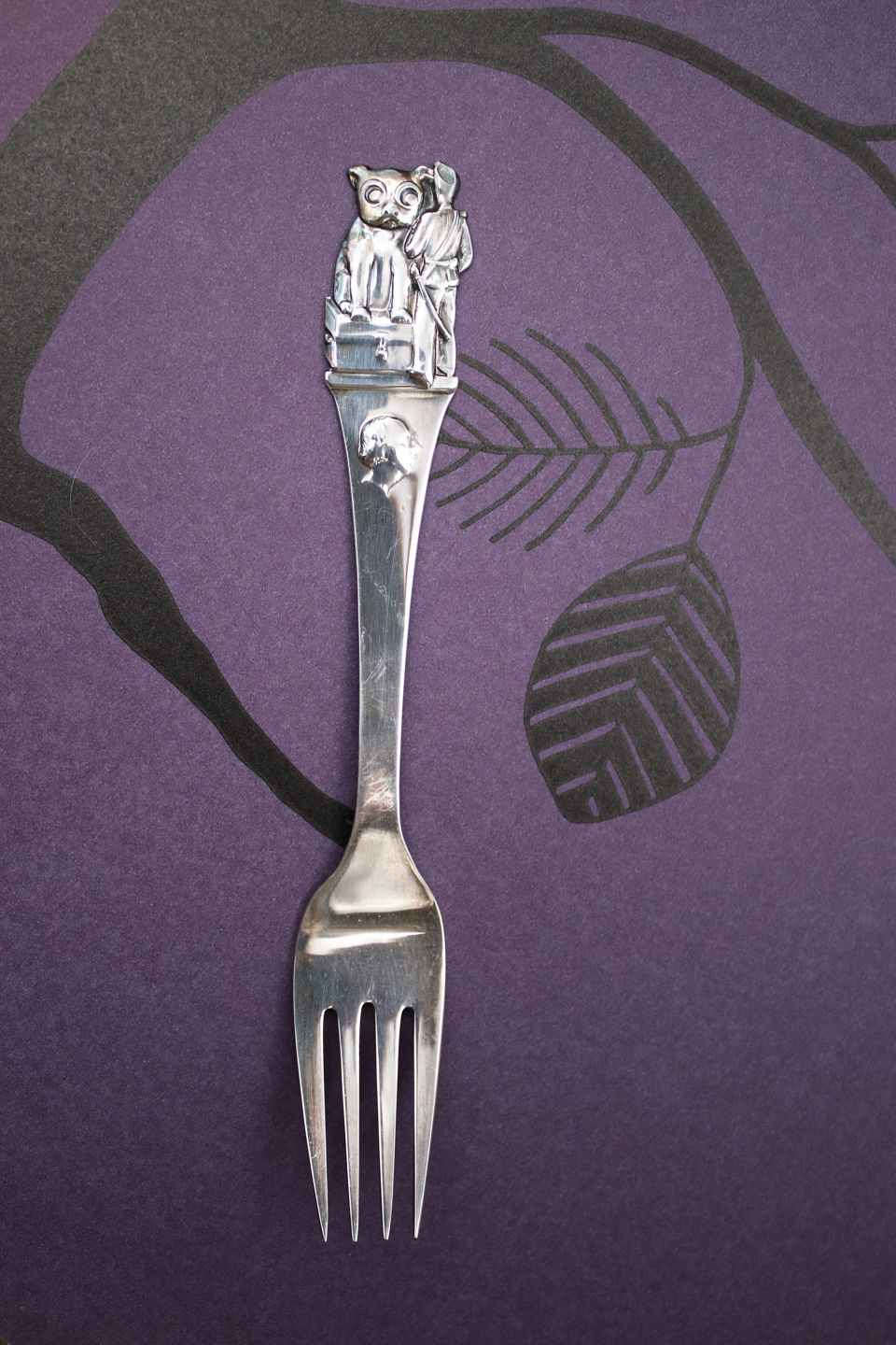 Barnegaffel i sølv (stemplet) med børnemotiver