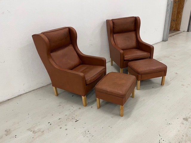 Mogens Hansen MH195 Ohrensessel mit passendem Hocker. Cognacfarbenes Semianilinleder, Eichenholzbeine. Neupreis: 62.606 DKK. Die Sessel sind in sehr gutem Zustand und wurden nur selten benutzt. Sie stammen aus einem Nichtraucherhaushalt ohne Haustiere. Das Set ist auch einzeln inklusive Hocker erhältlich. Preis pro Set (Sessel und Hocker): 17.000 DKK. Exklusive, hohe Ohrensessel im klassischen und zeitlosen Design von Mogens Hansen. Die Sessel sind mit Daunenpolstern ausgestattet, die optimalen Komfort und eine elegante, einladende Optik garantieren. Ein Sessel, der Ästhetik und Funktionalität vereint und jedem Interieur Stil und Komfort der Extraklasse verleiht. Die passenden Hocker sind aus den gleichen exklusiven Materialien gefertigt und entsprechen der gleichen Designlinie. Dank der Daunenpolsterung bieten die Hocker hohen Sitzkomfort und ergänzen die Stühle harmonisch. Designer: Mogens Hansen Maße – Stuhl: Länge: 72 cm, Tiefe: 90 cm, Höhe: 106 cm, Sitztiefe: 51 cm, Sitzhöhe: 42 cm Maße – Hocker:
