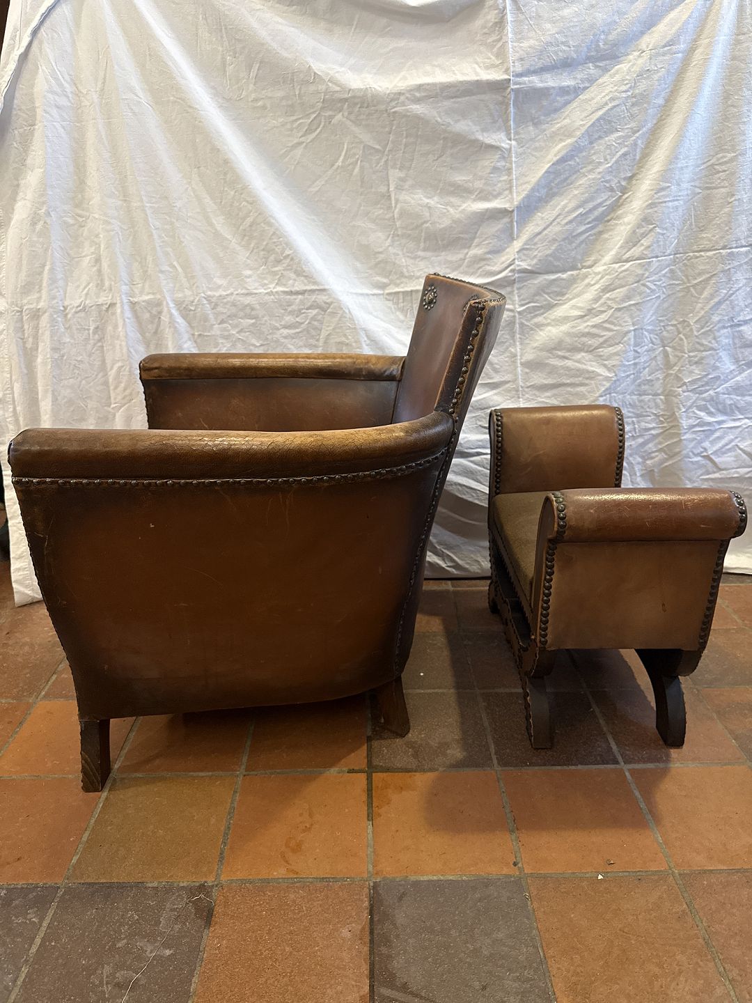 Text zugänglich auf Dänische: Otto Schulz lænestol i søm beslået patineret skind m. pude i stof. Samt tilhørende skammel i søm beslået skind m. sæde i velour betræk.