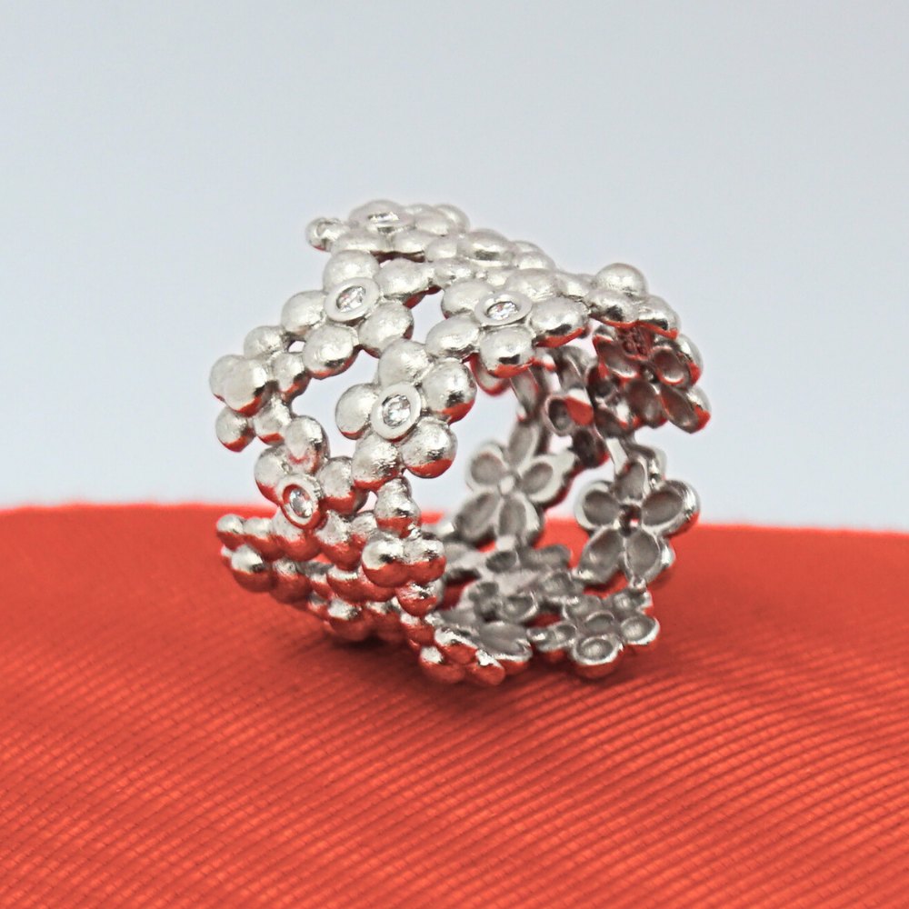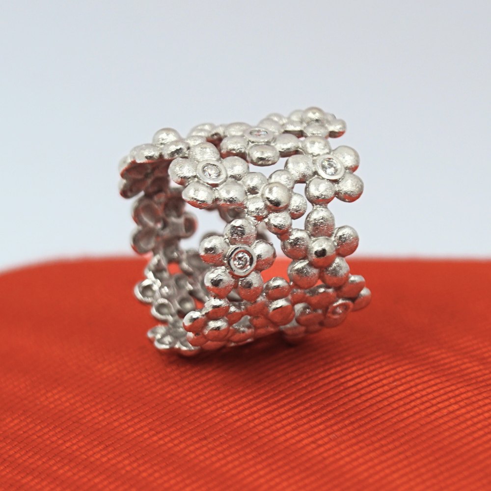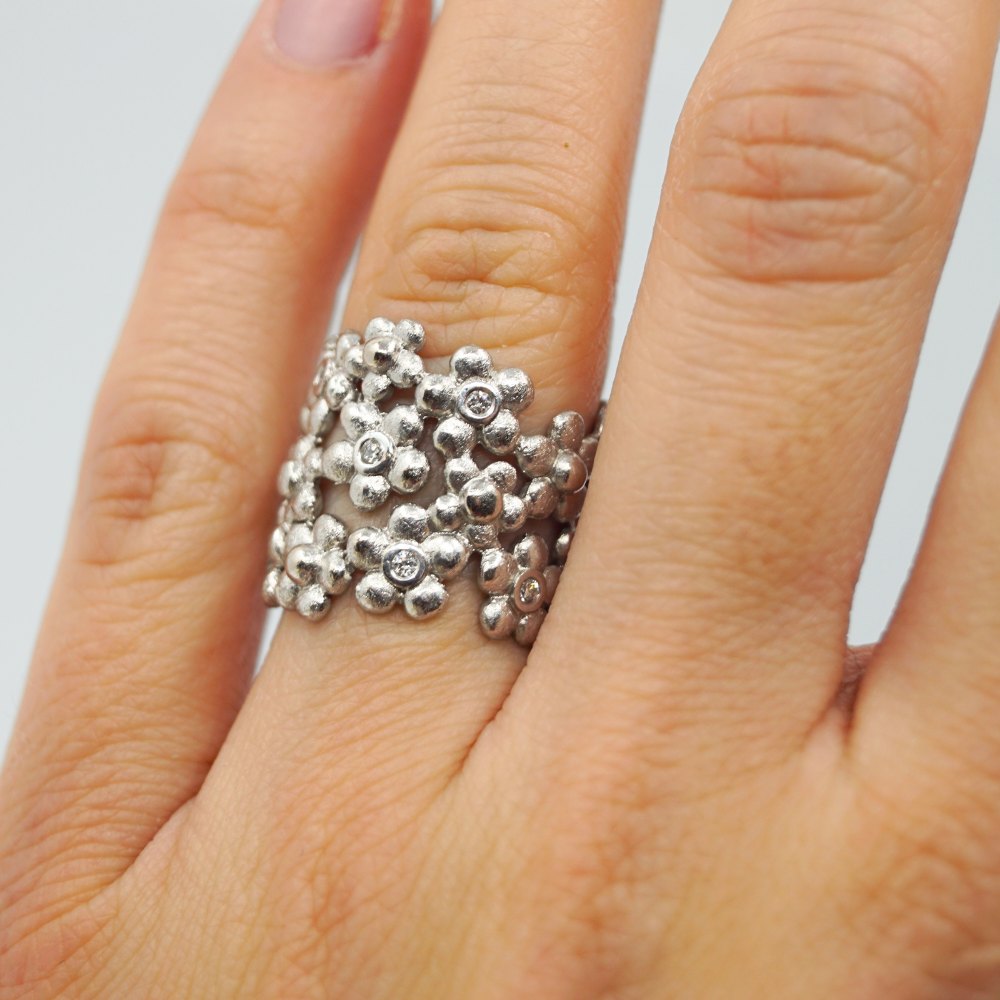 Text zugänglich auf Dänische: Ole Lynggaard; Hyldeblomst ring i 14 kt. hvidguld med diamanter