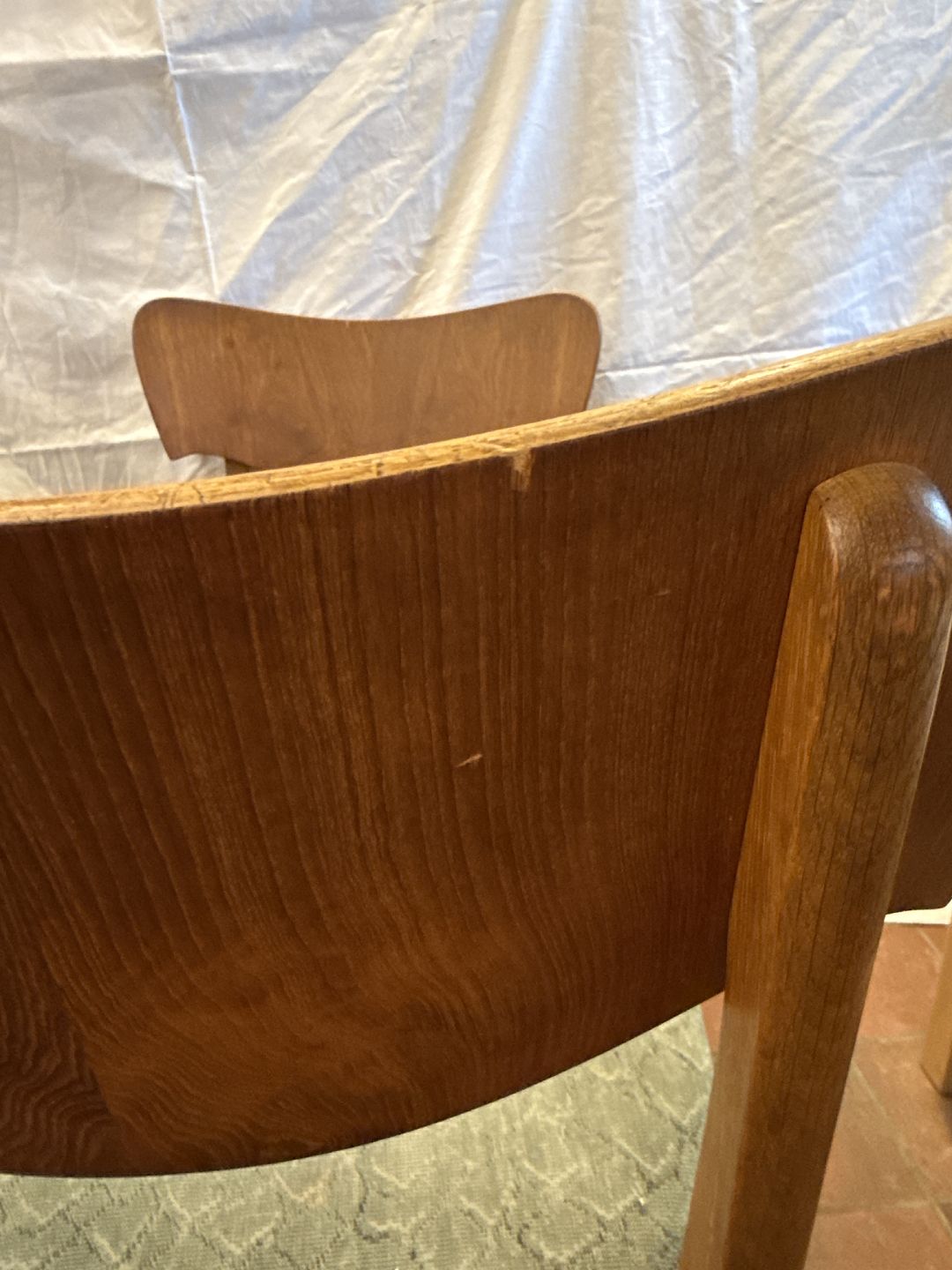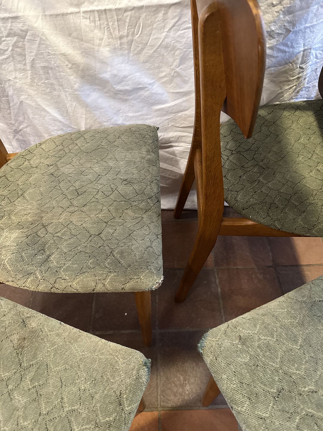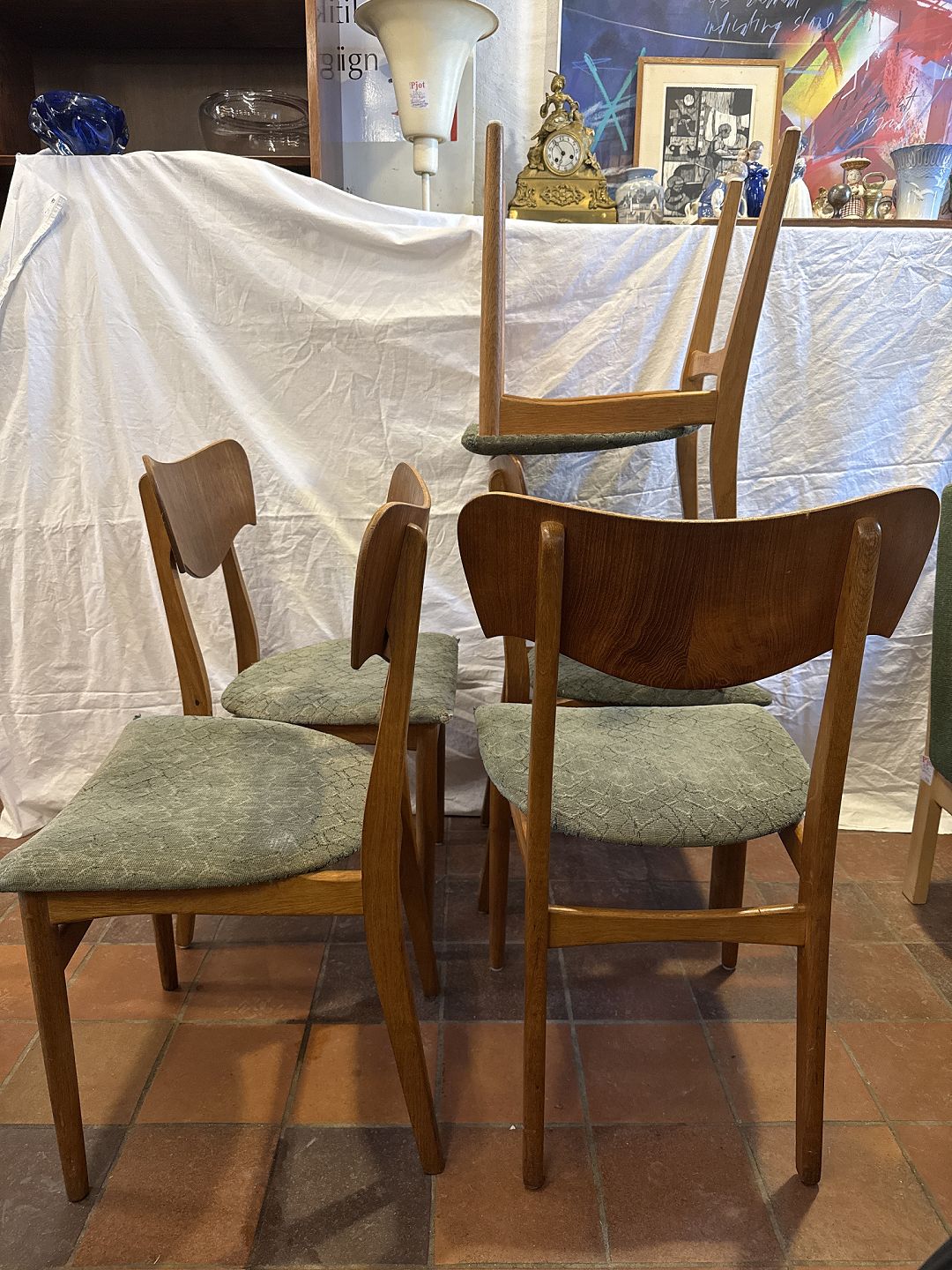 Text zugänglich auf Dänische: Dansk møbelproducent sæt af 5 spisestuestole i eg m. rygstykke i fineret teak samt sæde betrukket med stof. Fremstillet ca. 1950'erne.