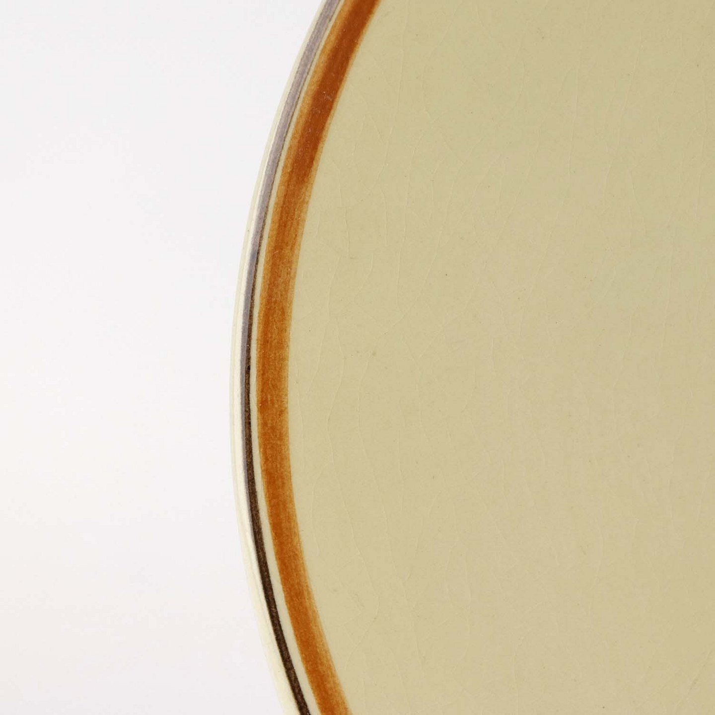 Fajancestel med dekoration af frugter på gullig baggrund med brun og orangerød kant stribe